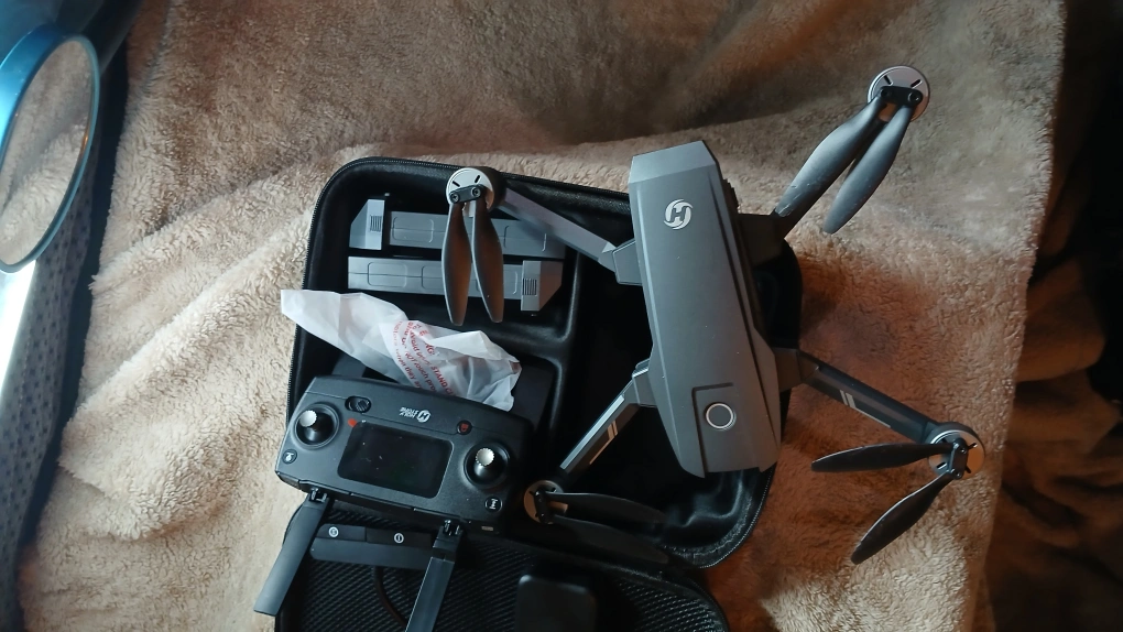 Foldable drone. Includes carrying case, two batteries, charger, remote, and extra propellers. Great for aerial photography. Used condition.
