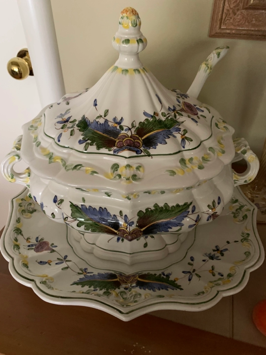 Large porcelain soup tureen. Features a floral design in shades of blue, green, and yellow. Includes a matching underplate and ladle. Ornate detailing and a domed lid.