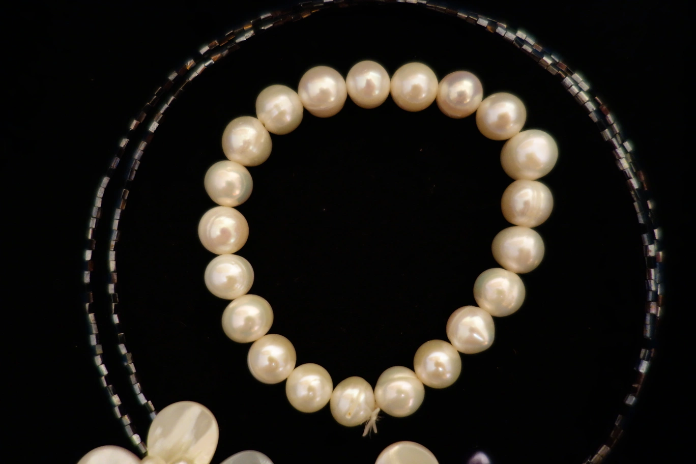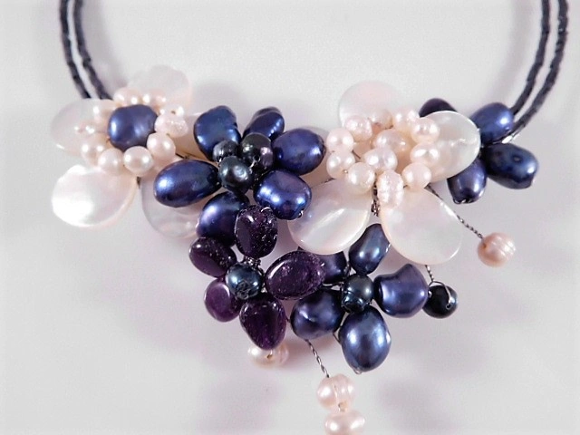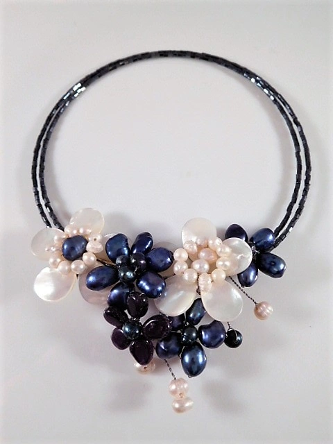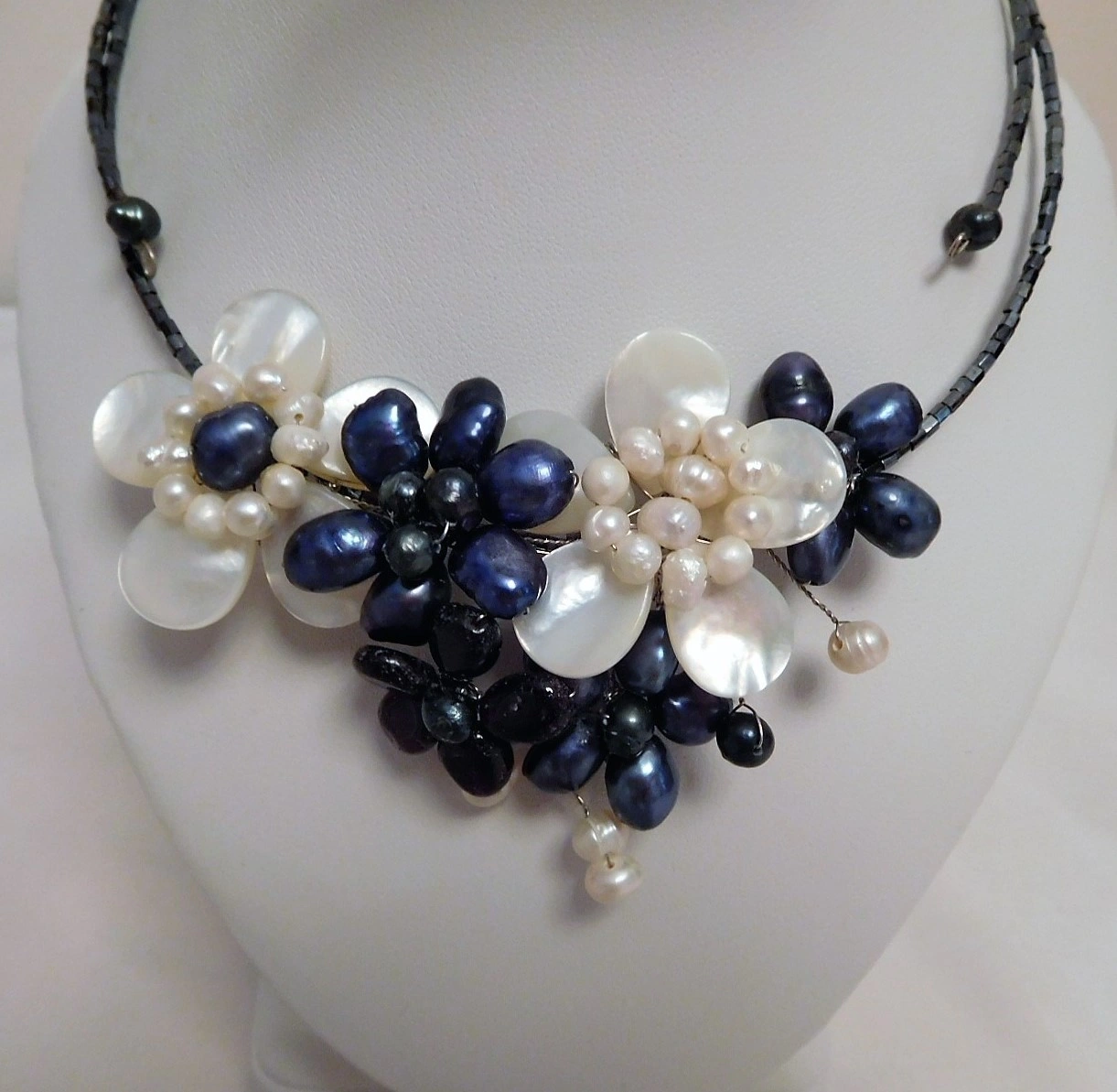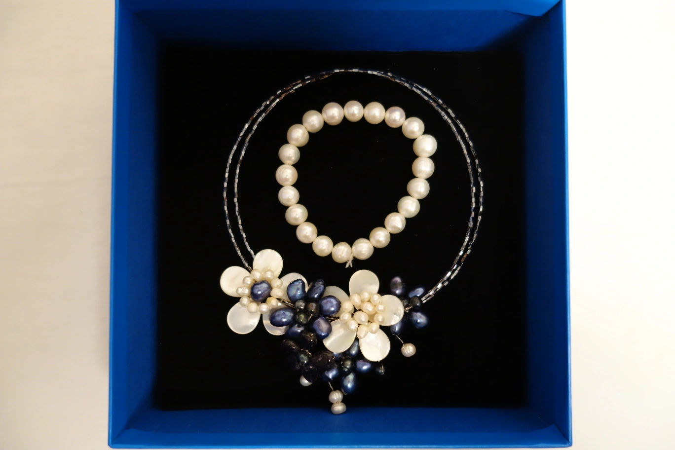 Beautiful necklace and bracelet set. Features white and dark blue genuine cultured freshwater pearls, and floral shaped mother of pearl. Comes in a blue box. Lovely gift.