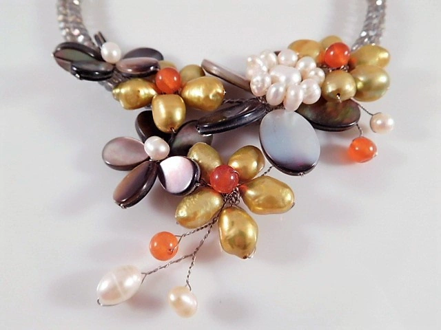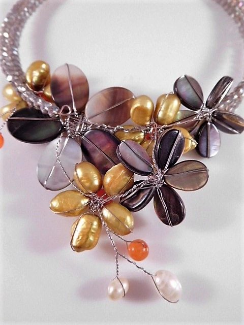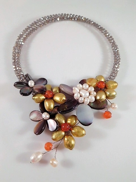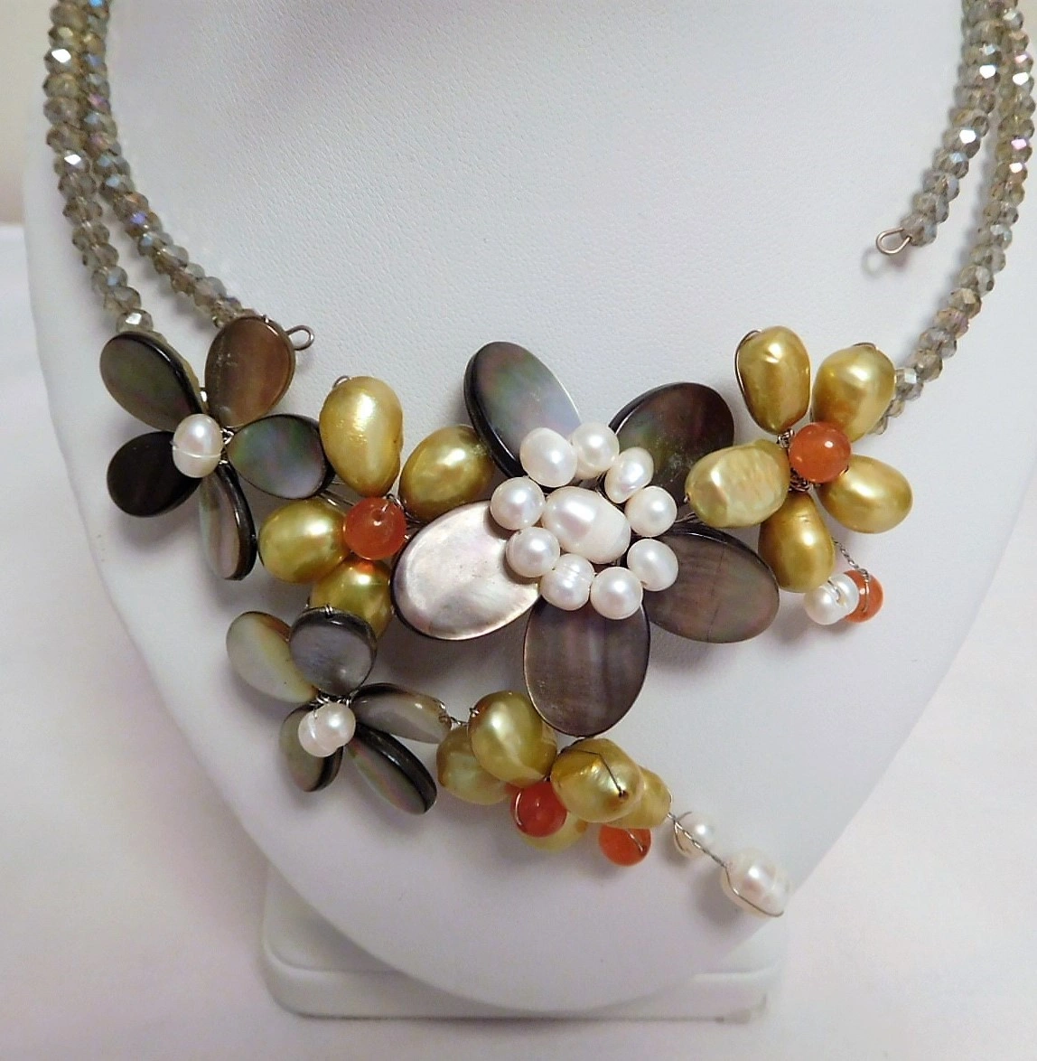 Stunning statement necklace. Features several genuine mother of pearl floral accents. Made with iridescent shell, cultured freshwater pearls, and crystals. Elegant and eye-catching.