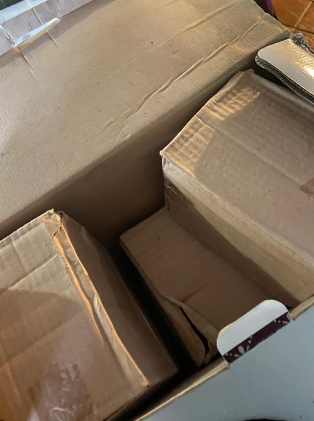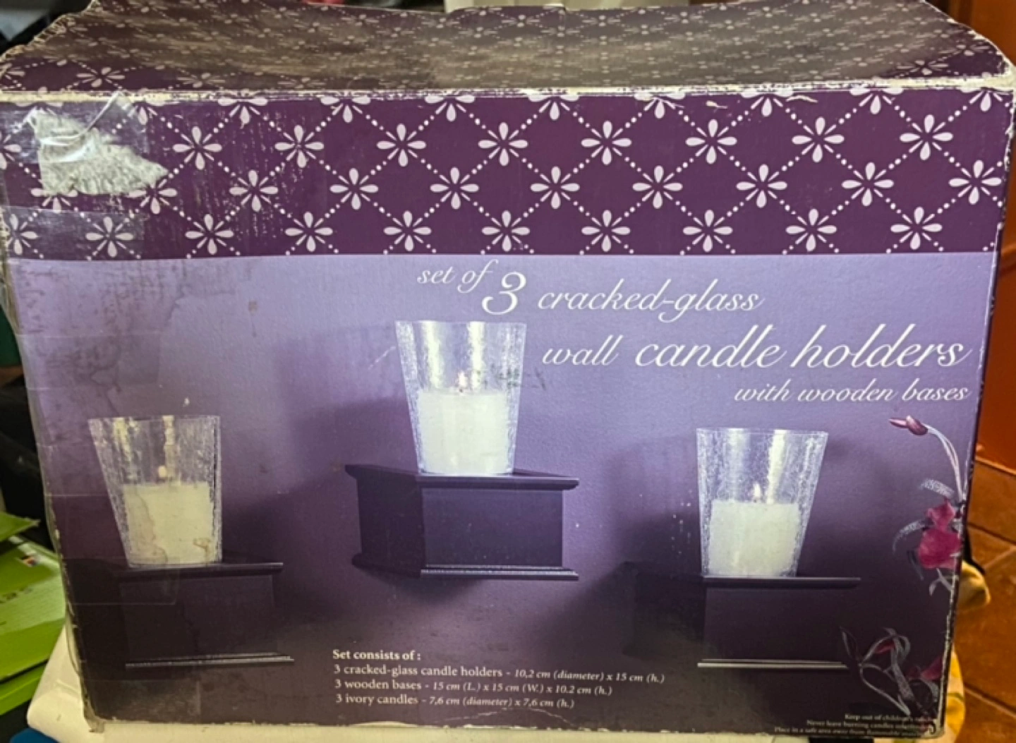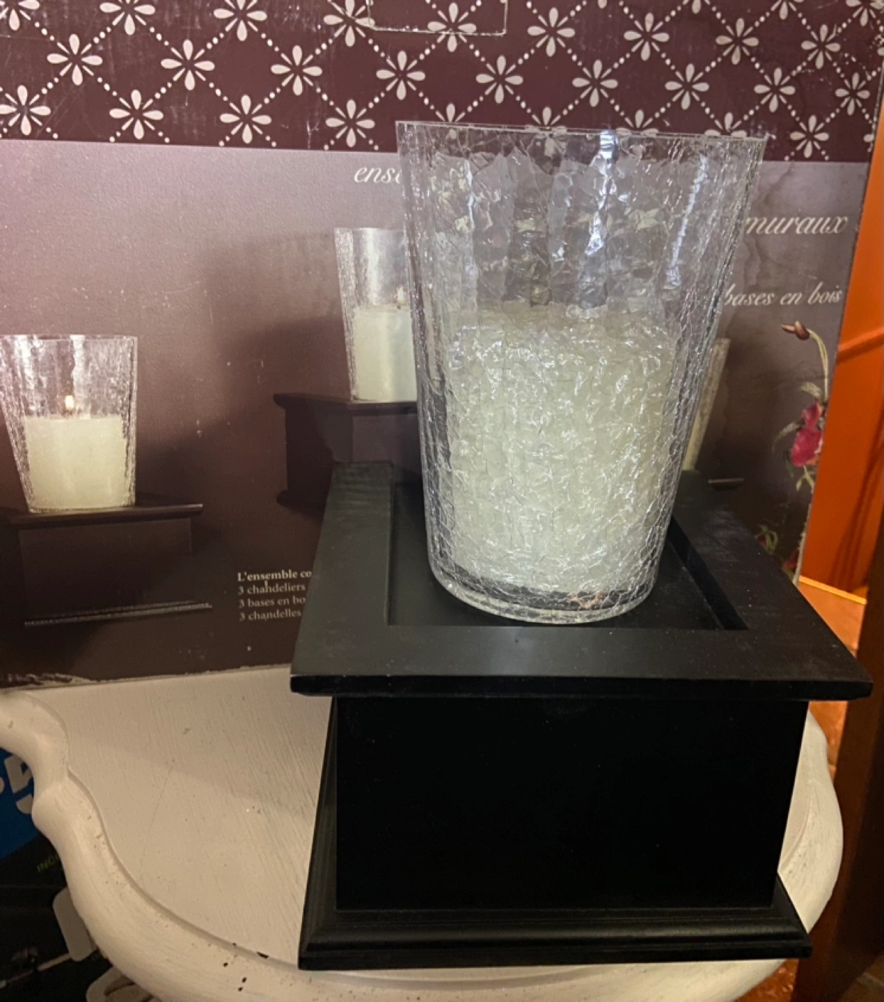 Three cracked-glass candle holders. Wooden bases included. Ivory candles also included. Measurements provided on box.