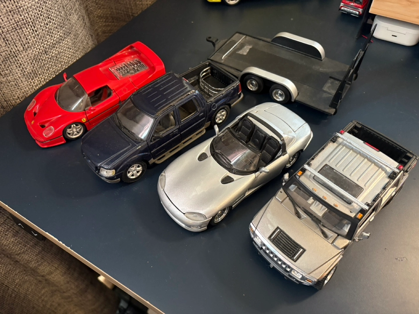 On sale are 4 Maisto-branded diecast cars— a Hummer H2 (1:27 scale), a Ferrari F50 (1:24 scale), a Dodge Viper RT/10 (1:24 scale), and a Ford Explorer Sport Trac pickup truck (1:25 scale). There is also a 1:24 scale trailer.