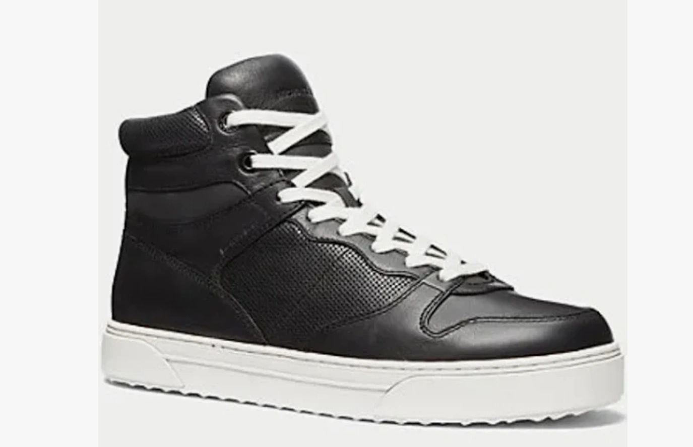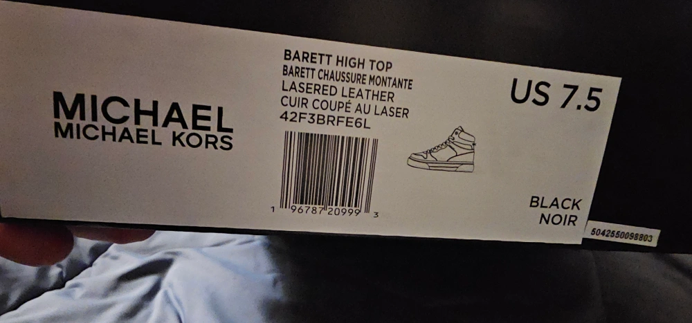 Michael Kors Barrett high-top sneakers. Black leather upper, white laces, and a white sole. Size US Men 7.5
