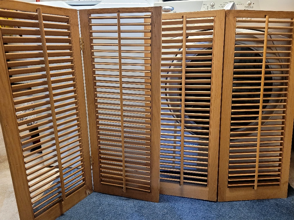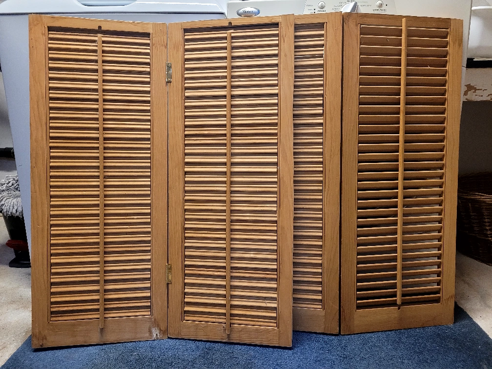 37*adjustable slats *unfinished solid wood *indoor *2 double hinged panels *small water mark on backside, bottom of 1 panel