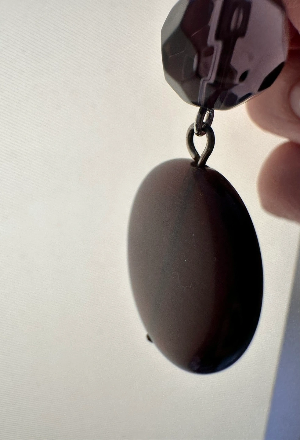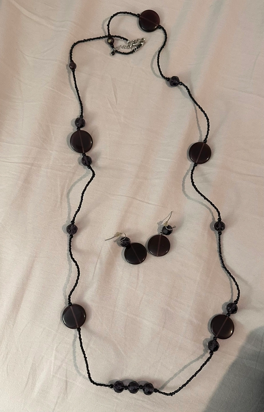 Stunning dark purple beaded necklace and earring set. Features dark purple/black faceted round beads and matching disc pendants. Long necklace, perfect for layering. Subtle and sophisticated.