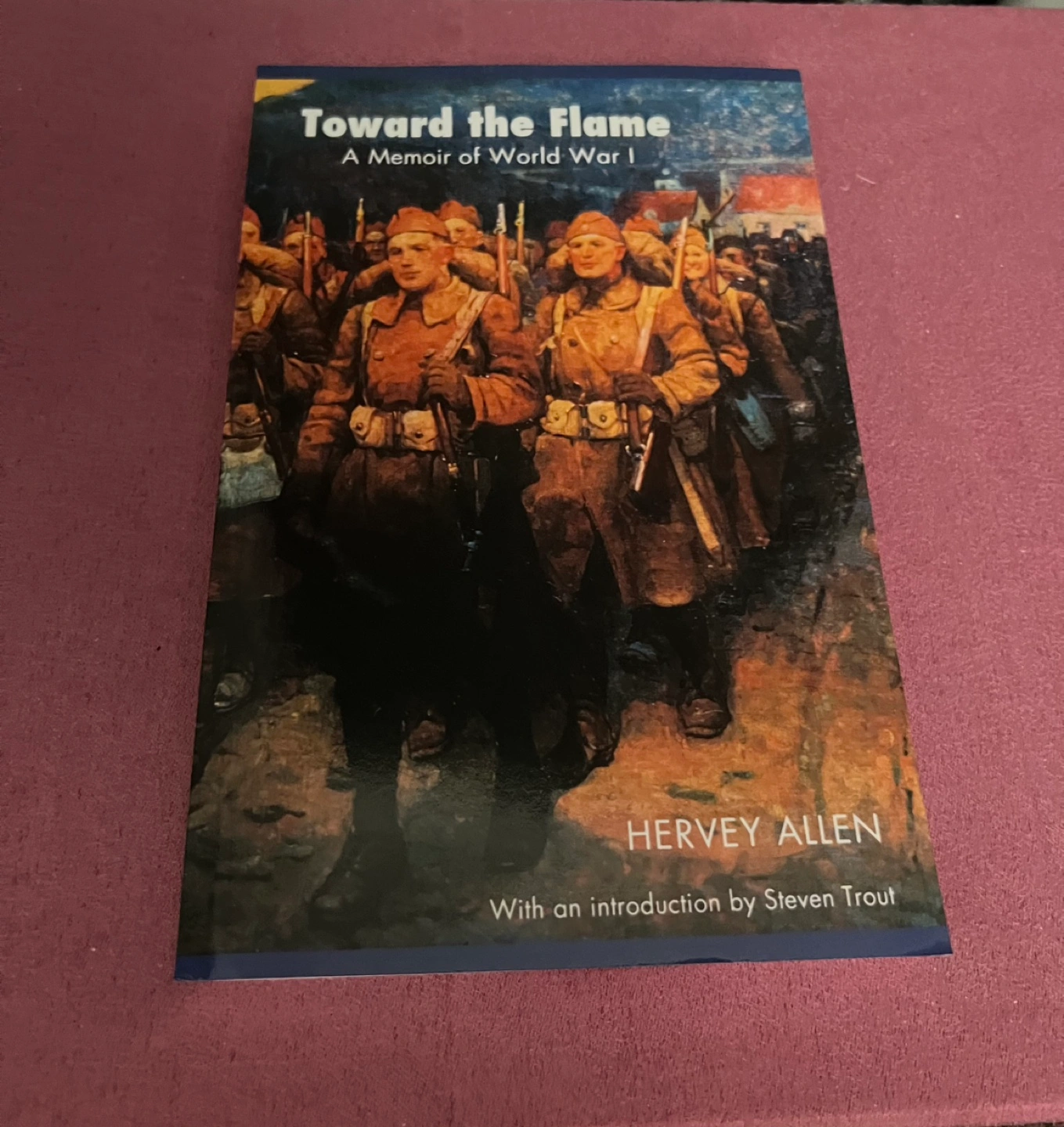 Paperback book. World War I memoir. Introduction by Steven Trout. Cover features painting of soldiers marching.