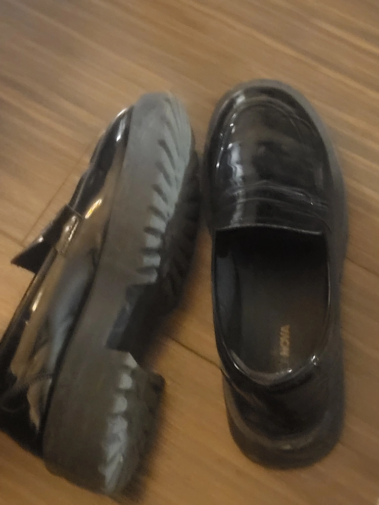 #freecycle Pair of black patent leather loafers. Platform sole. I love these. I even glued on some Achilles protectors.