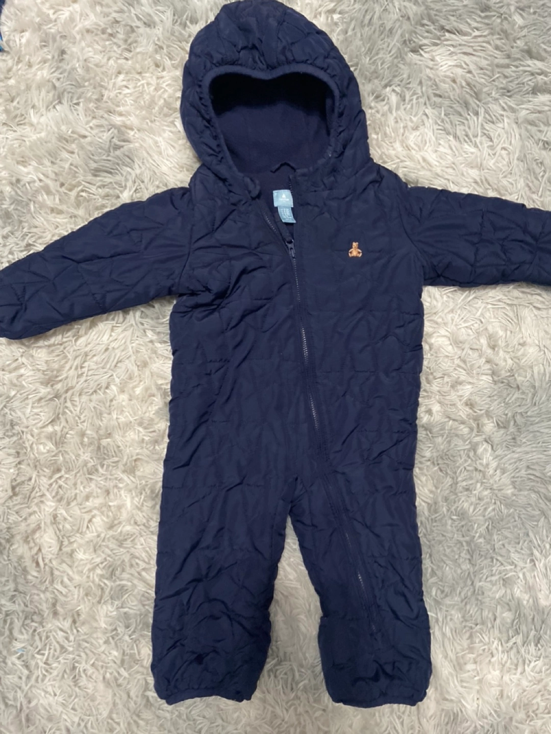Navy blue baby snowsuit. Zipper closure. Attached hood. Quilted design. Warm and cozy for winter. Size 6-12 months. Fabric at feet flips over to footed or leave open .