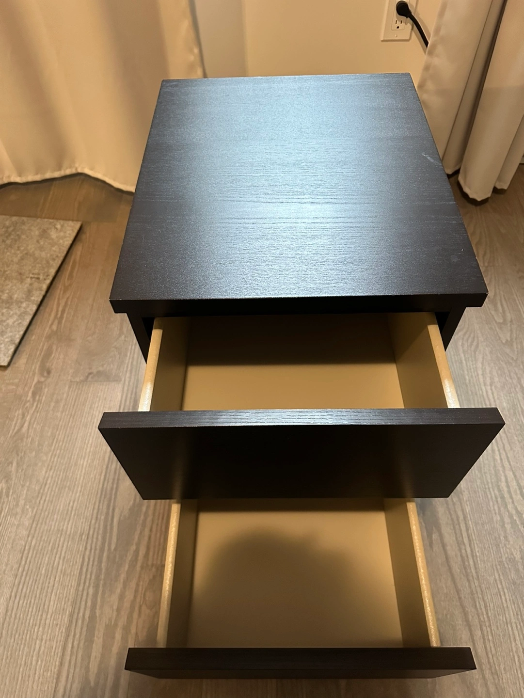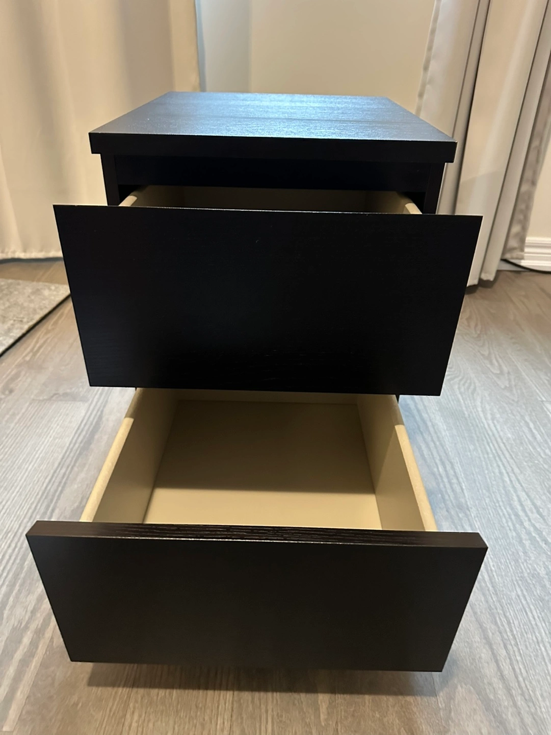 116Price for 2 nightstands ($80) • Excellent Condition • Dark Brown Veneer Finish Price for Matching Bed Frame and 4 Drawers ($400) • Ample Storage Space – 4 large drawers under the bed • Reinforced Slatted Base – Added pine wood to the existing IKEA slatted bed base for extra mattress support and durability Option to Bundle with Matching Nightstands – Bundle Price: $450 *Bundle pricing available if bed frame is still available.