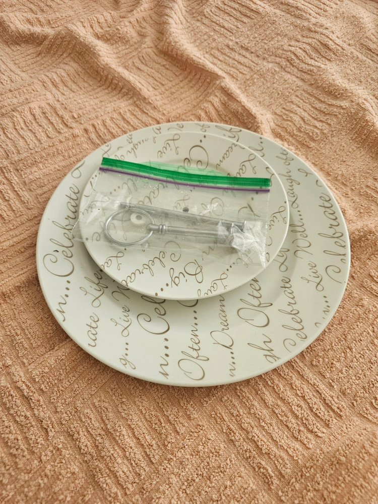 Three-tiered serving set. Features decorative plates with gold lettering. Includes a silver-toned cake stand.