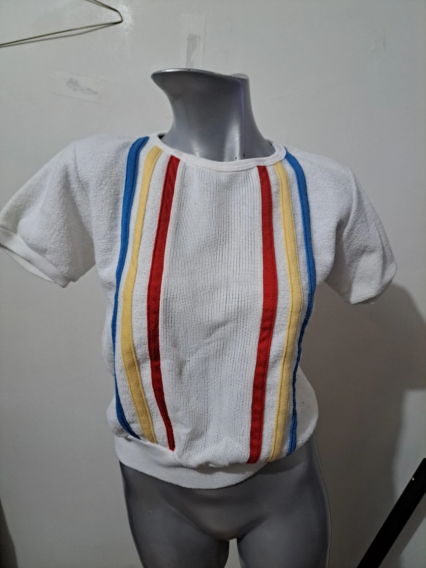 Adorable vintage terrycloth shirt. Features colourful stripes down the front. Short sleeves. Medium