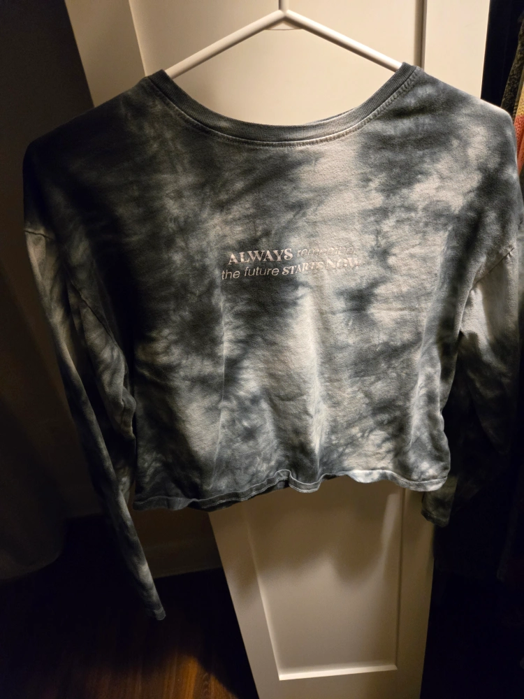 Grey tie-dye long sleeve cropped top. Features a definition of "future" on the back and a smaller phrase on the front. Size 13-14, made in Turkey.