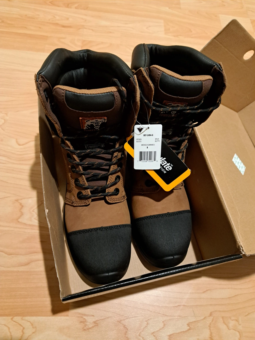 Brand new Kodiak men's work boots. Brown leather upper, black toe cap. Thinsulate insulation. Lace-up style. Durable outsole. Size 9.