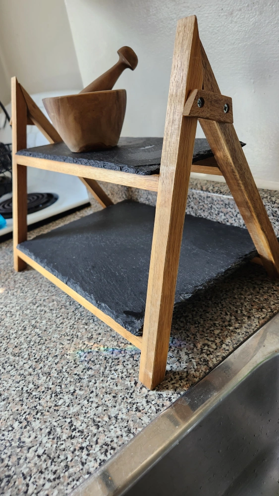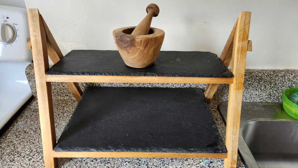 Two-tiered serving stand, made with slate shelves & acacia wood and light brown wooden frame. Includes a small wooden mortar and pestle. Perfect for spices or small snacks.