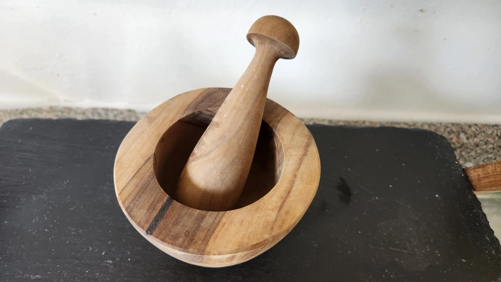 Two-Tiered Slate Serving Stand with Wooden Mortar and Pestle