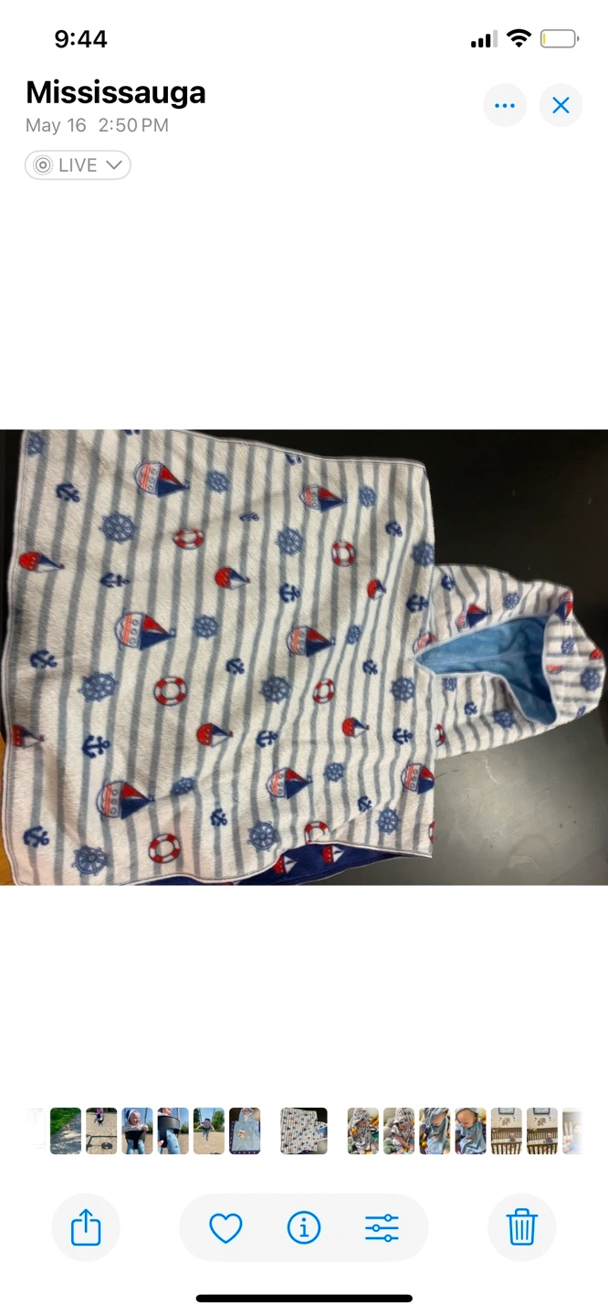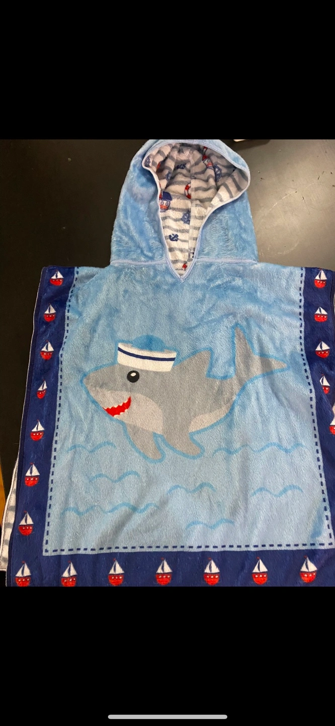 83Cute hooded poncho towel, nautical theme. Perfect for the beach or pool. Soft material, great for drying off quickly. Features a shark design and small sailboats.
