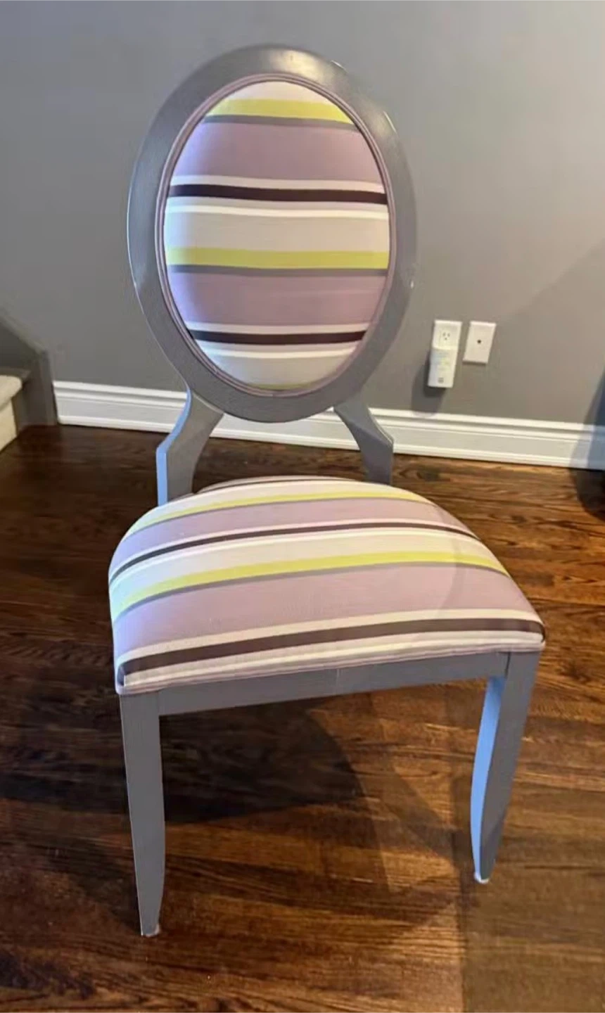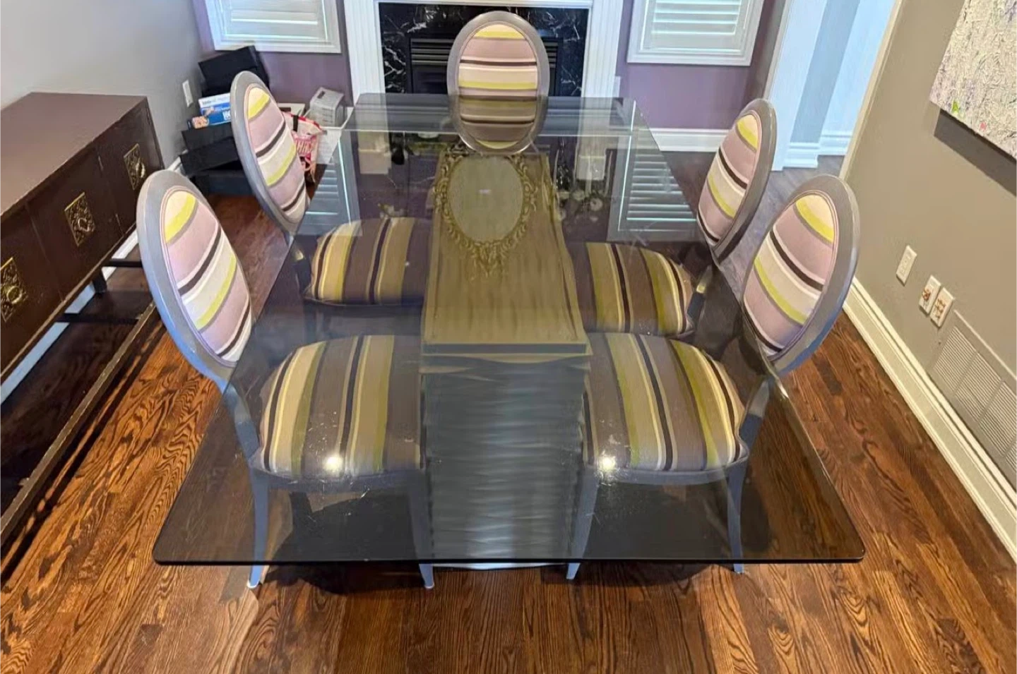 This is a glass-top dining table with a unique carved base. It comes with six matching chairs upholstered in a colourful striped fabric. The chairs have grey frames and oval backs. A beautiful set for your dining room!