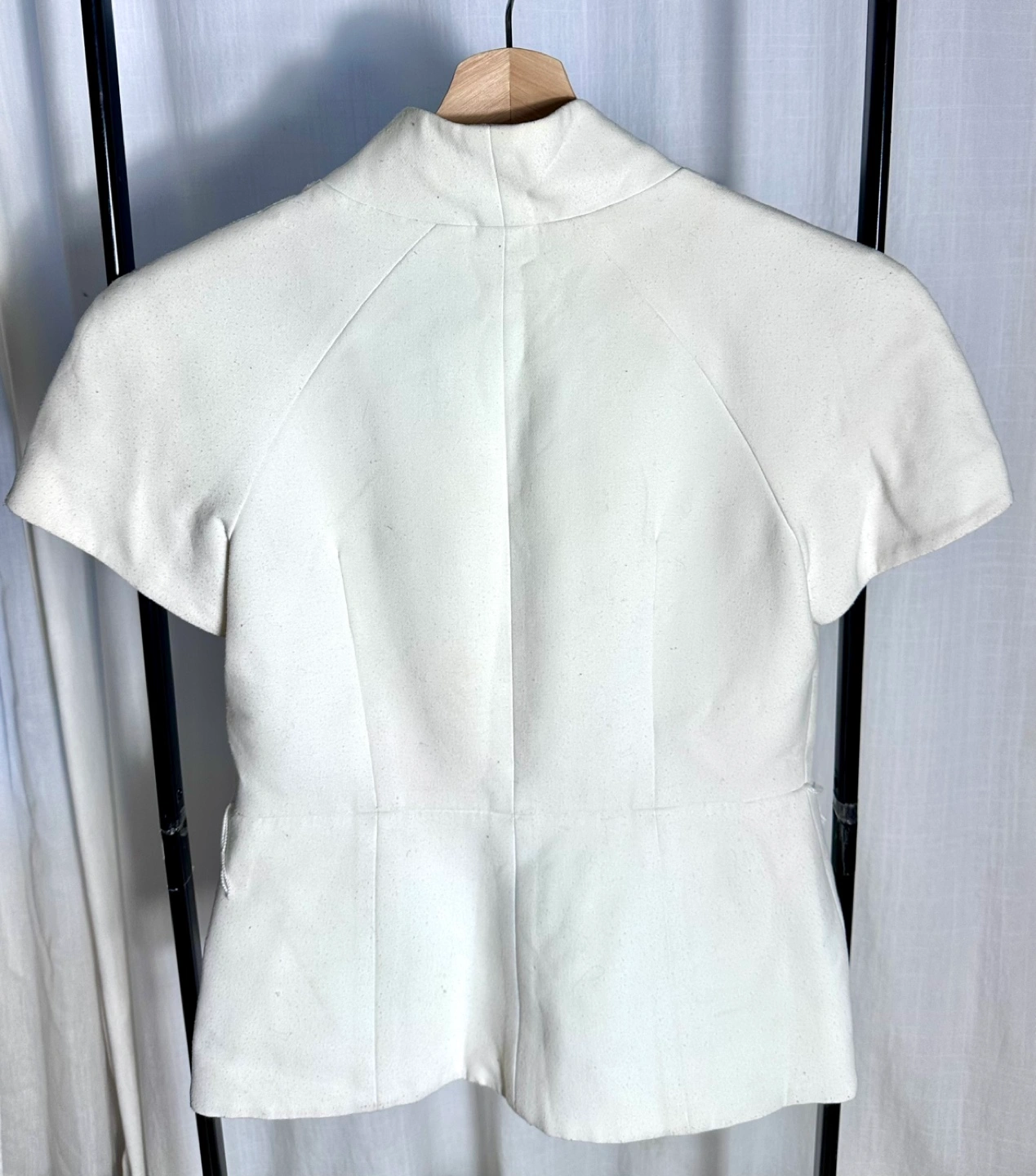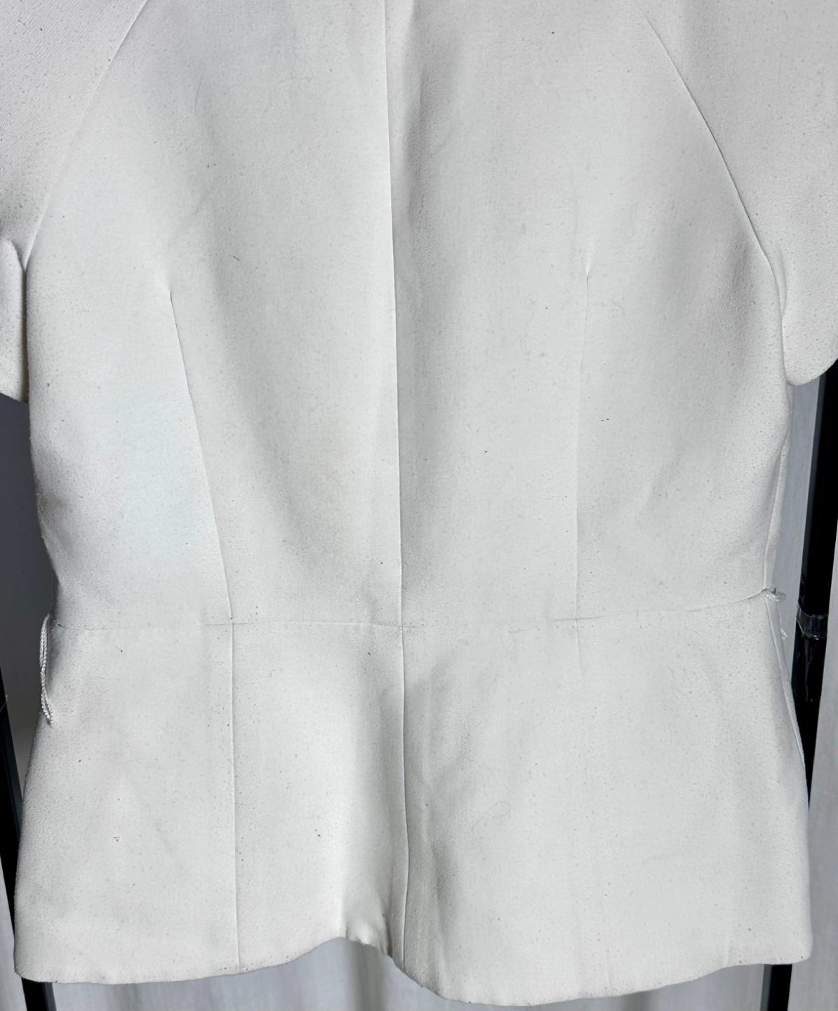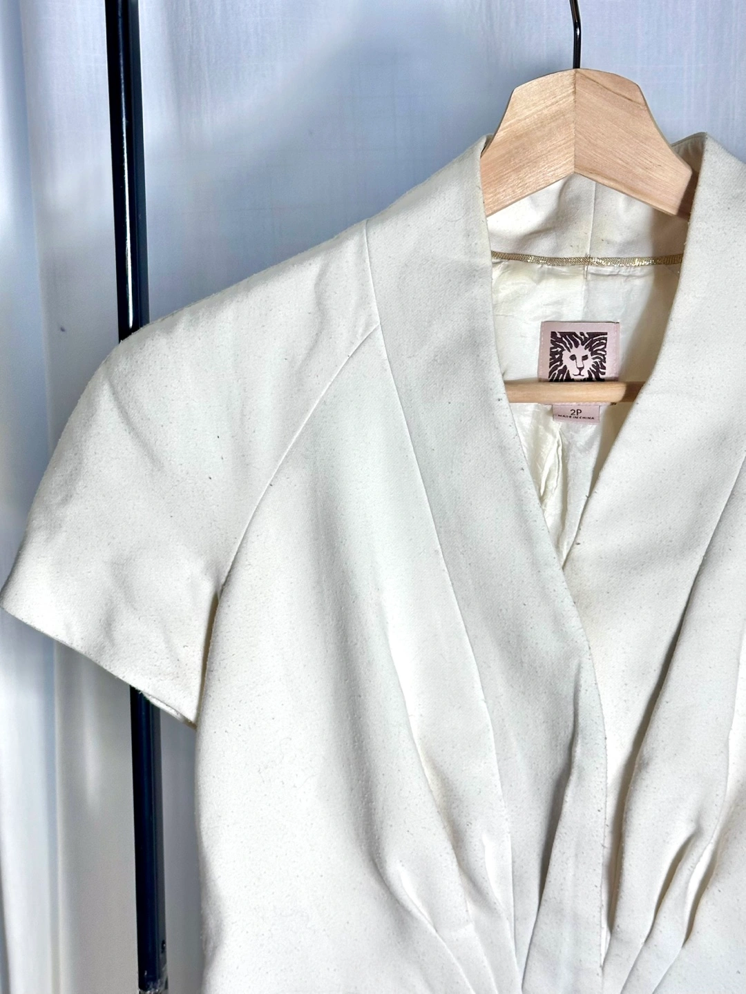 Cream-coloured, short-sleeved cropped blazer. V-neck. Two front pockets. Fitted waist. Lightweight material. Slight imperfection on belt line seen in photos.