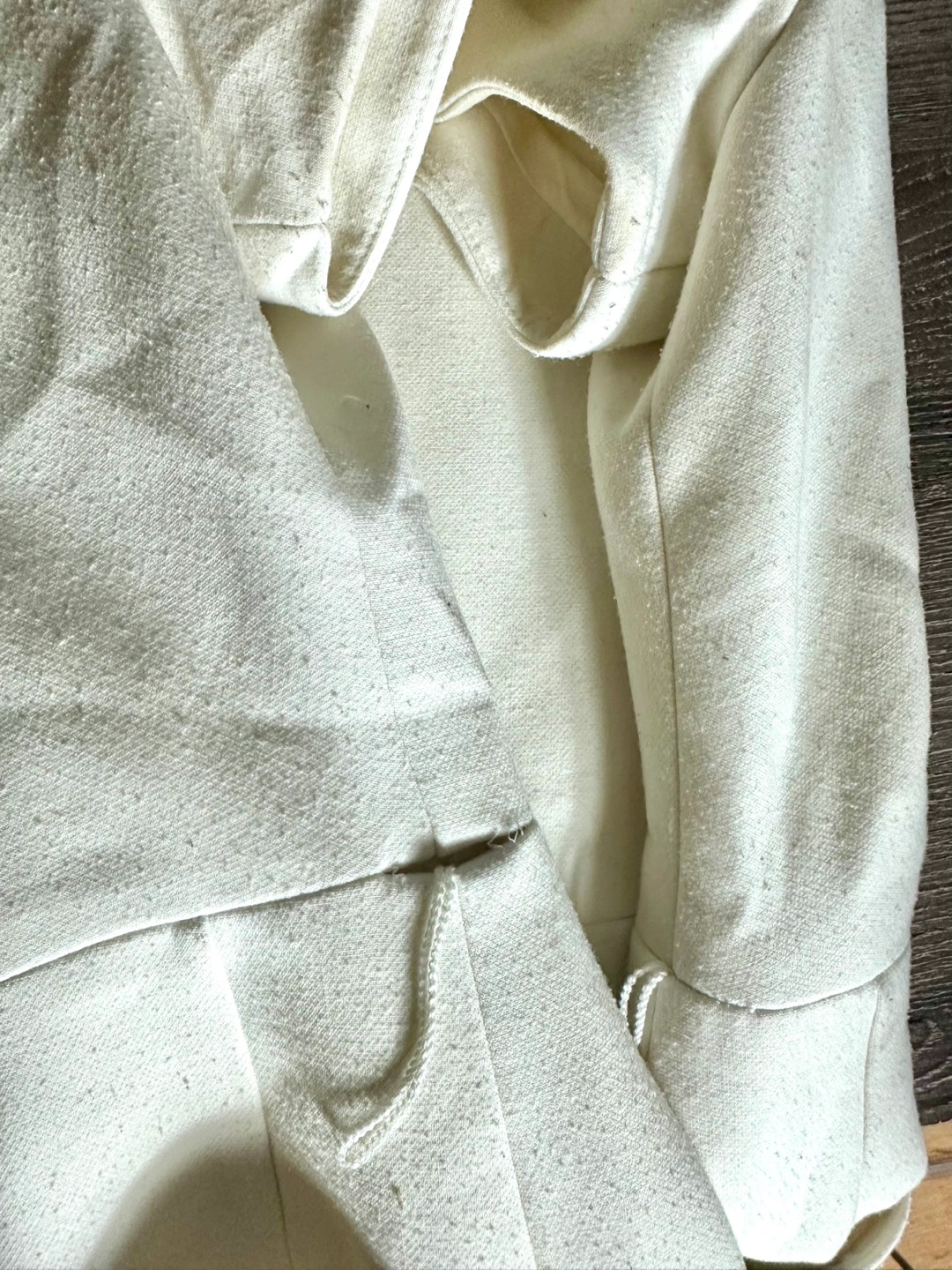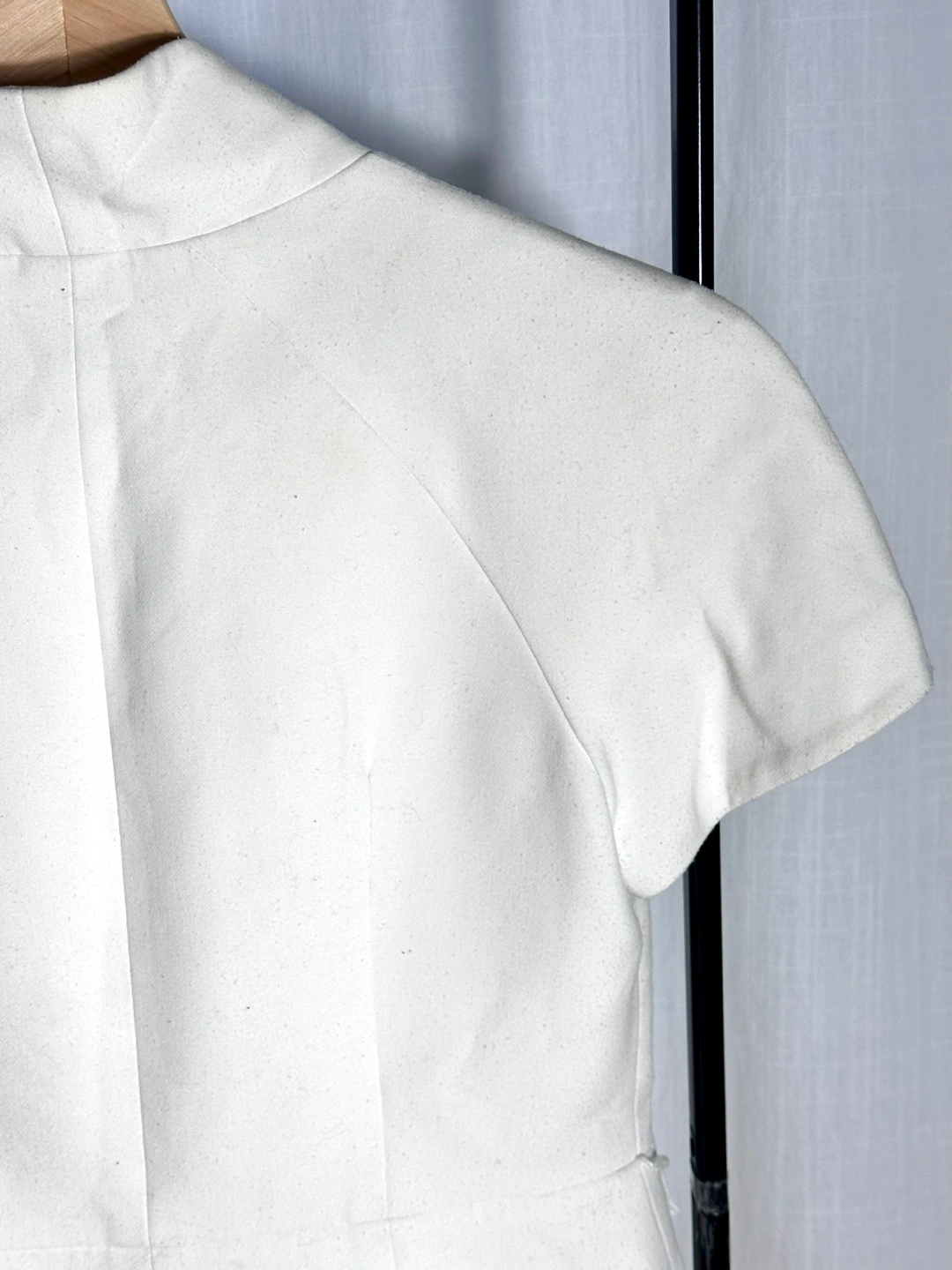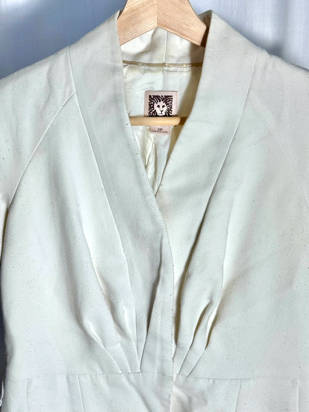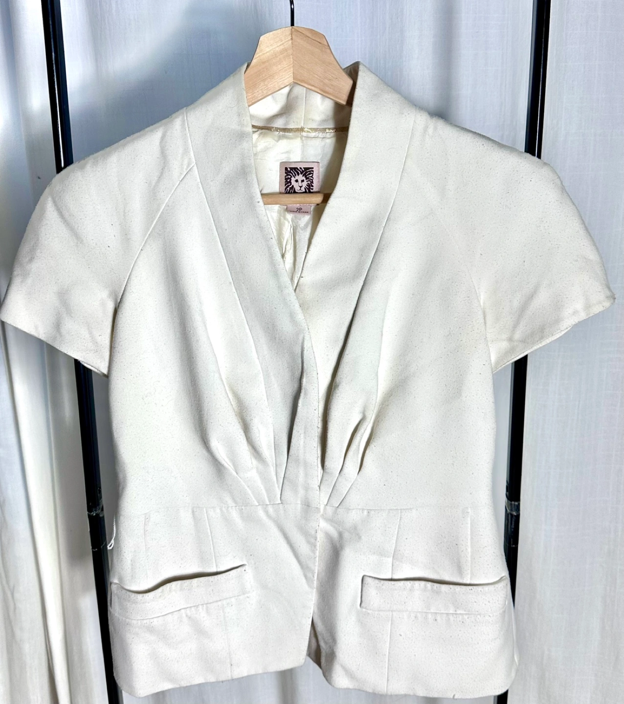 Cream-coloured, short-sleeved cropped blazer. V-neck. Two front pockets. Fitted waist. Lightweight material. Slight imperfection on belt line seen in photos.