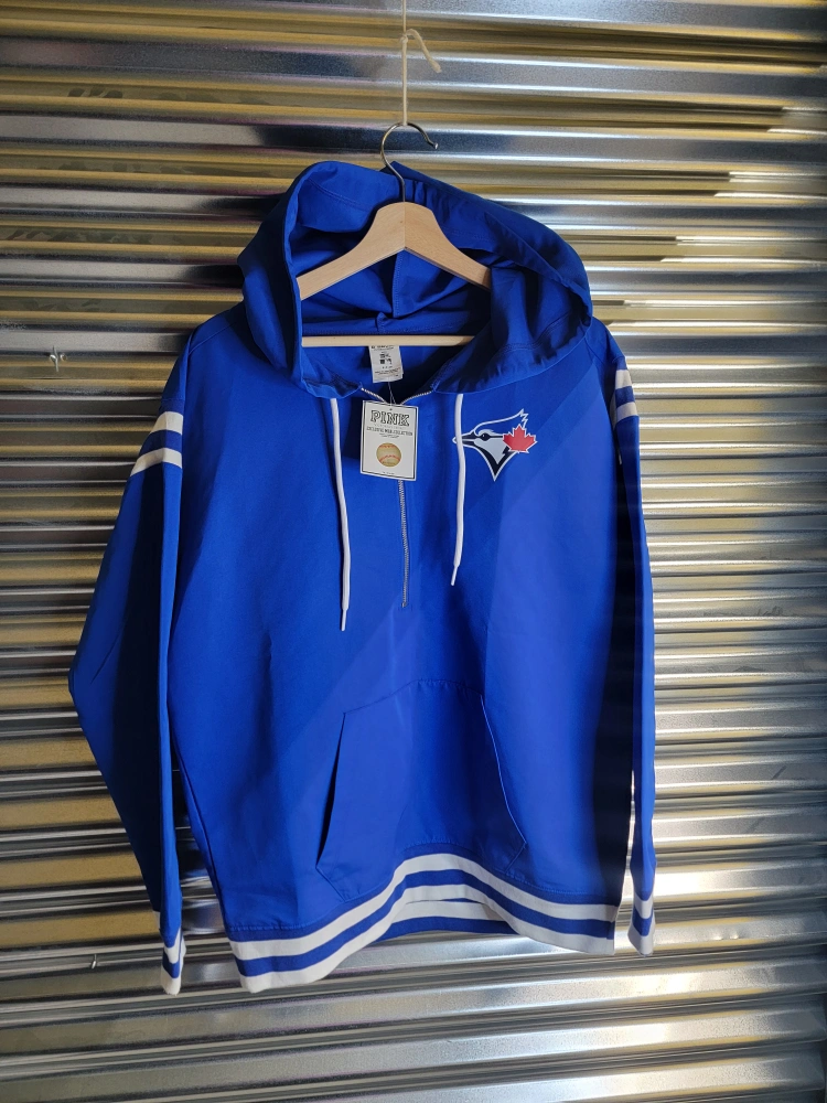 Blue Jays hoodie. Half-zip. Features team logo and Love Pink branding. White stripes on sleeves and hem. Brand new with tag.