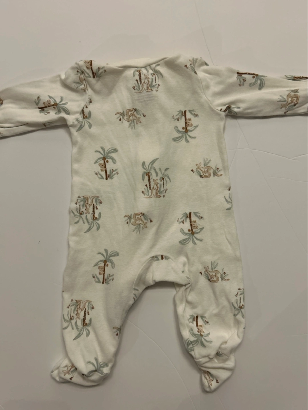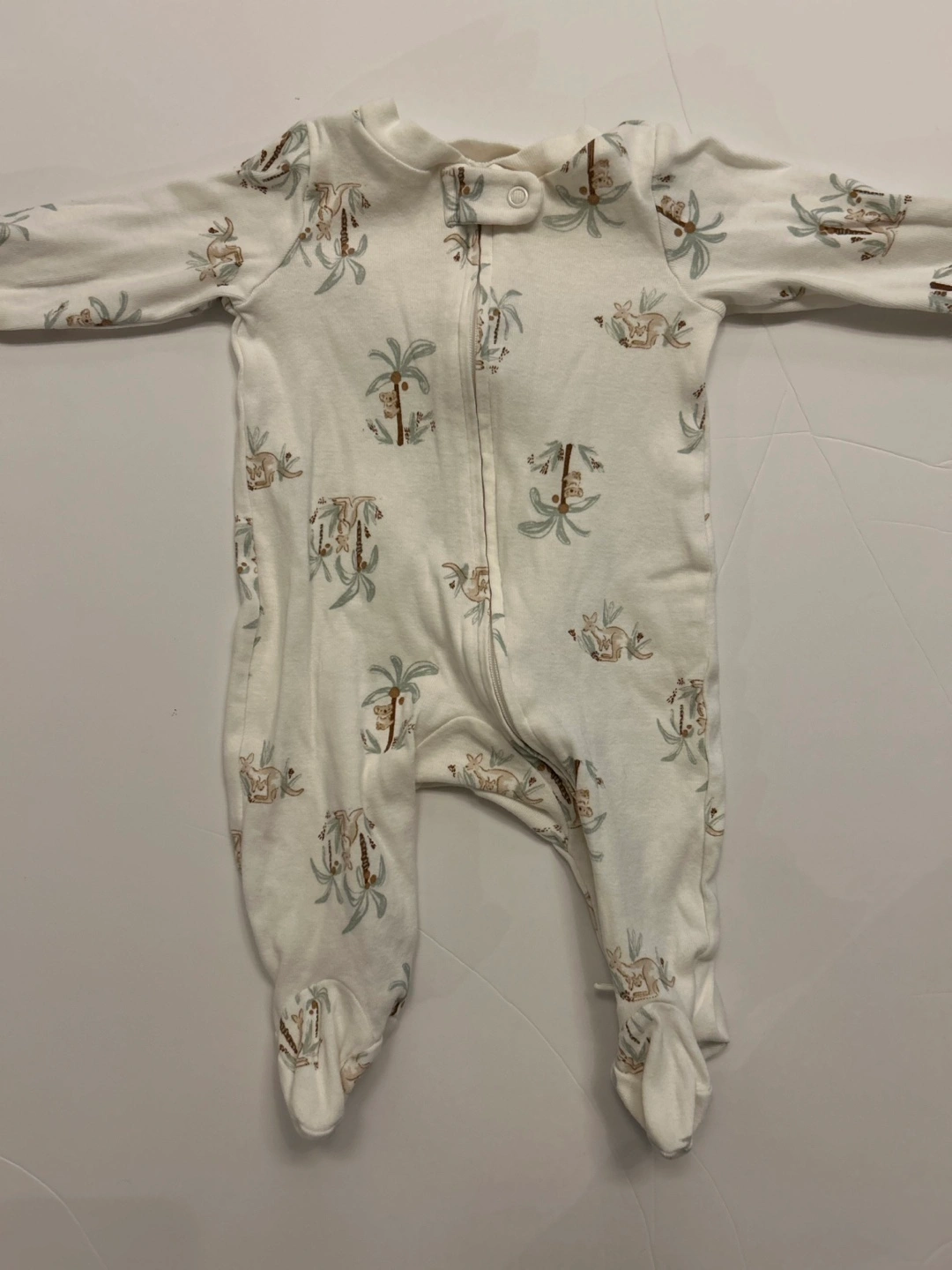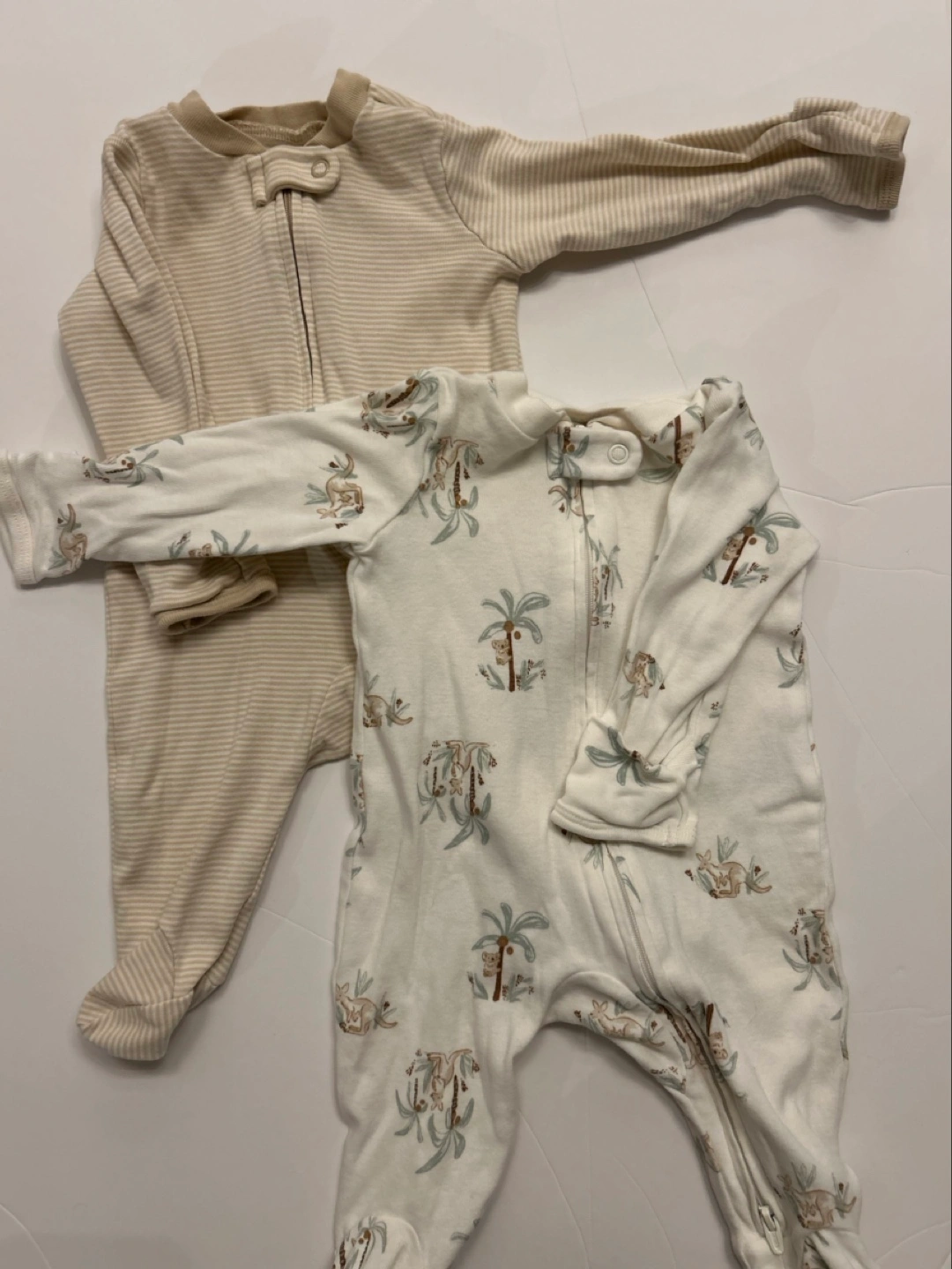 Two 3M baby sleepers. One features beige stripes, the other features a koala and palm tree print. Both have double zippers. Long sleeves, hand covers and footies.