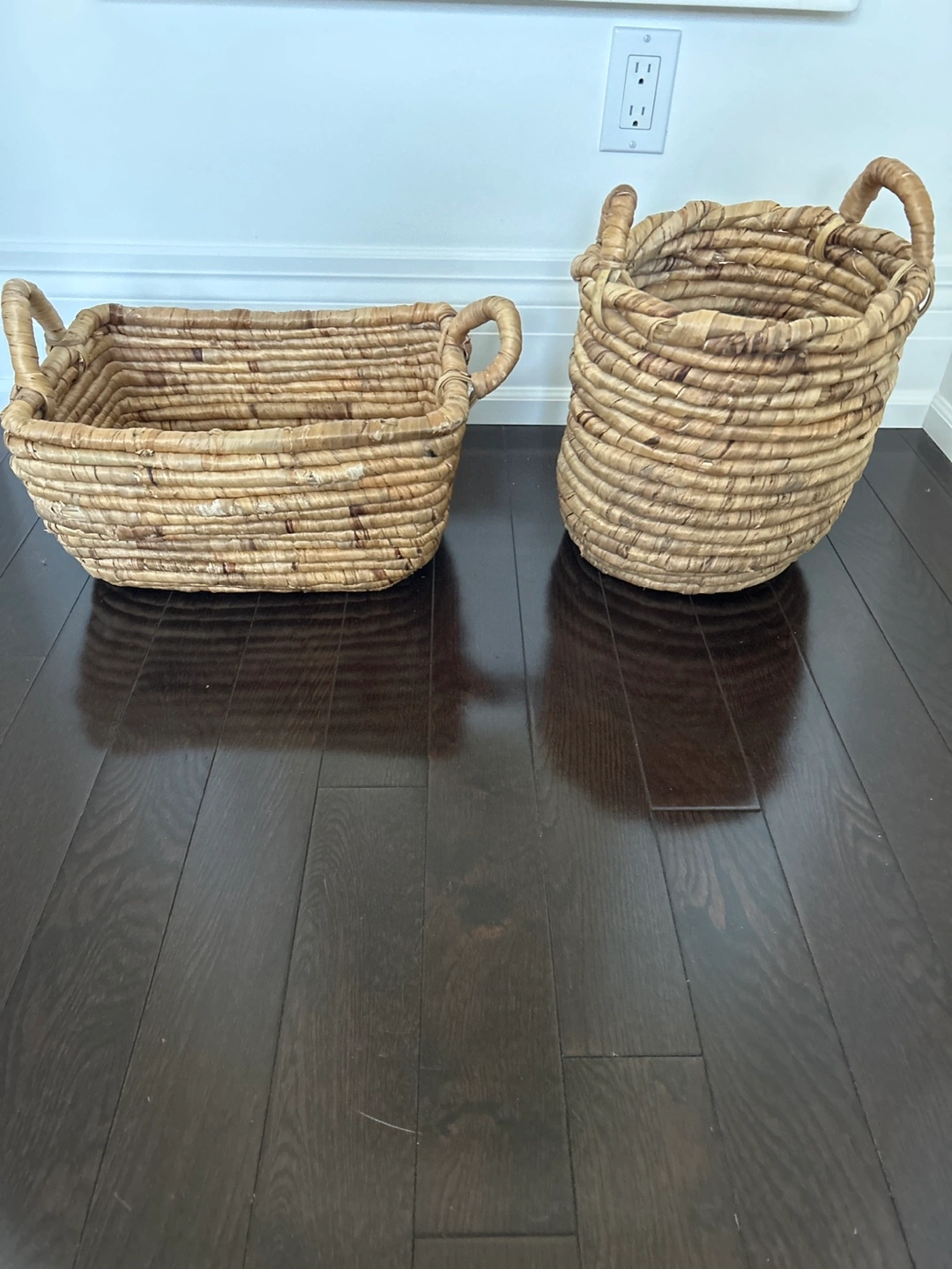 Two beautiful seagrass baskets. One rectangular, one round. Perfect for storage or decor. Good condition.