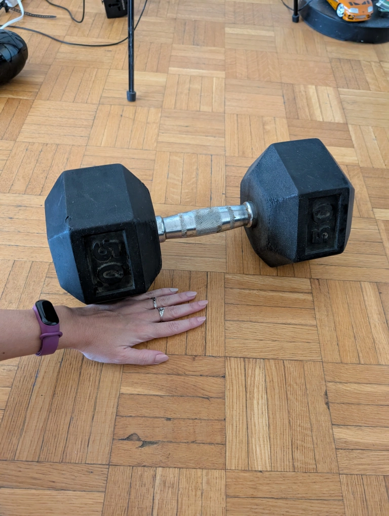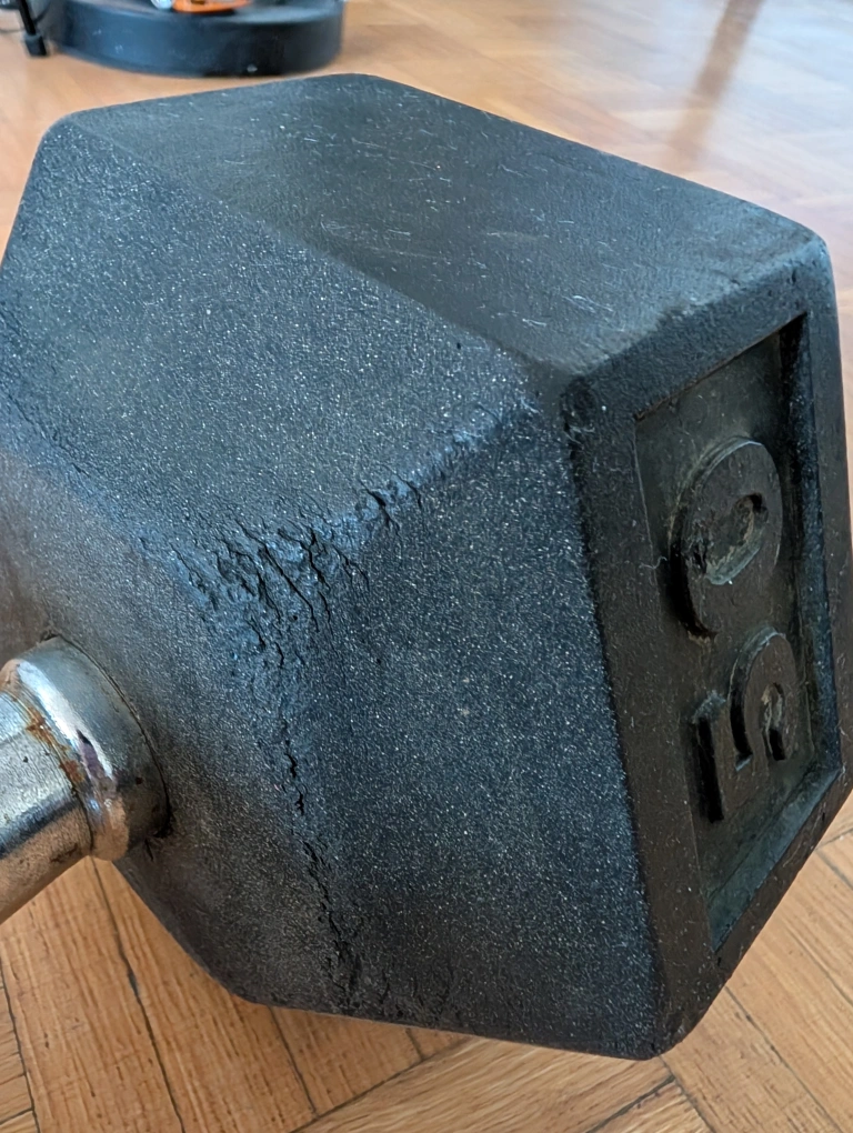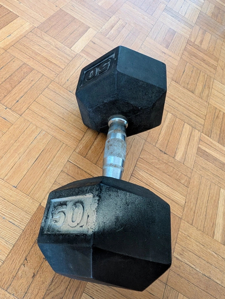 Used 50 lb hex dumbbell. Shows some wear, but it won't affect the usage.Good for home gym workouts. Solid construction. Please pick it up at the address on the map, cash only Take with you a bag or a shopping cart, it's heavy to carry on a distance 🌸