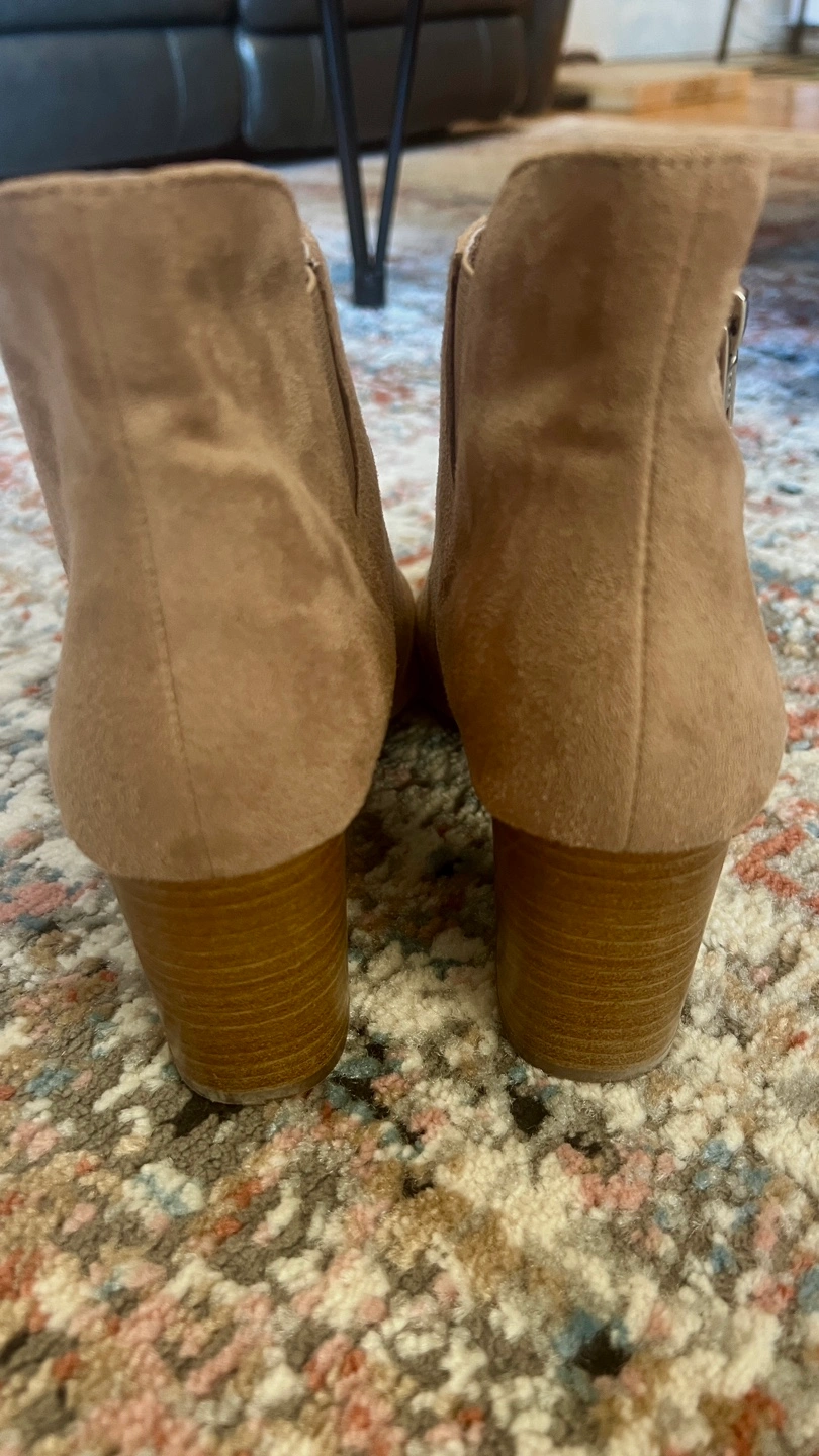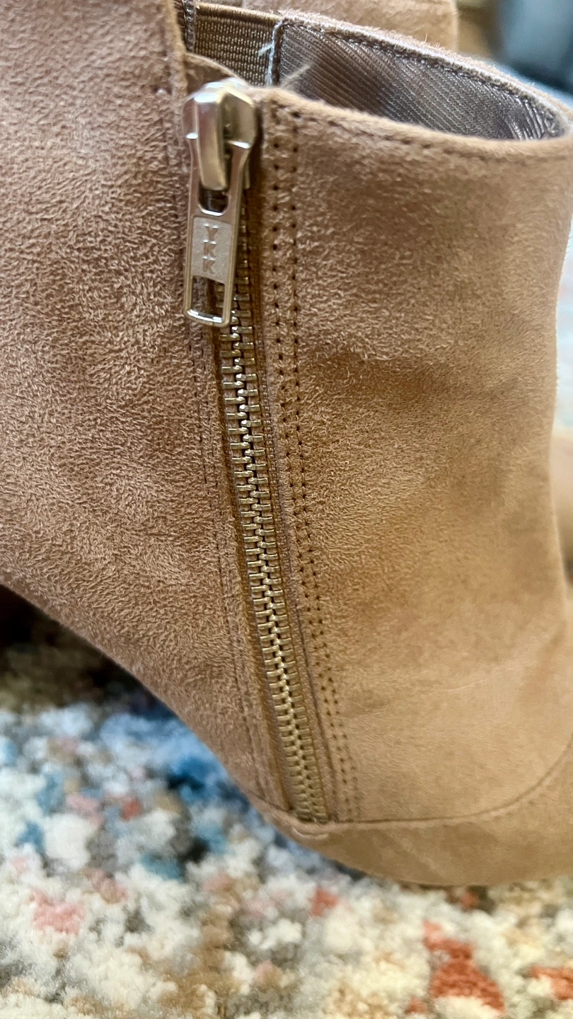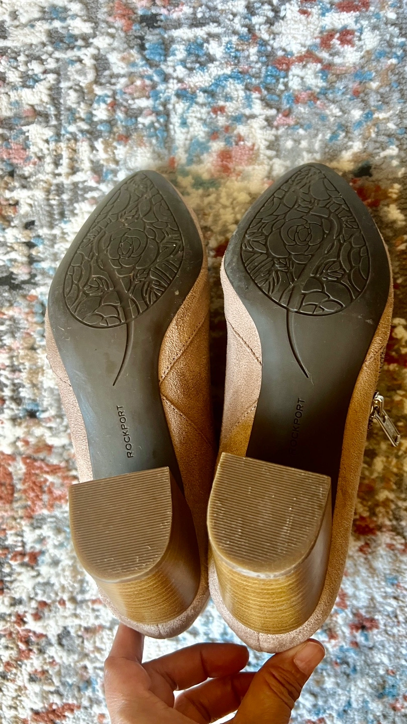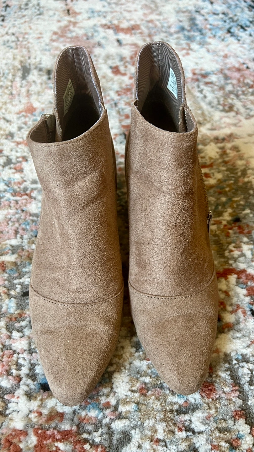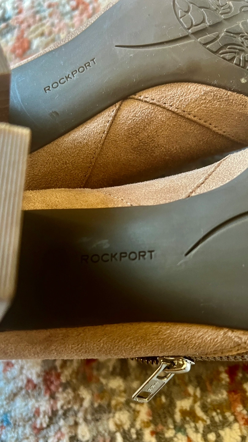 Pre-owned Rockport taupe suede ankle boots. Features a side zipper and block heel. Good for fall and winter. Very good condition, worn a few times.