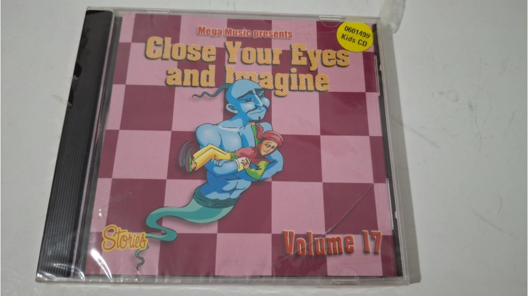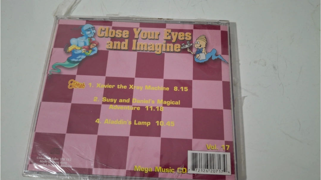 Mega Music presents Close Your Eyes and Imagine, Volume 17. Kids CD. Stories. Includes Xavier the Xray Machine, Susy and Daniel's Magical Adventure, and Aladdin's Lamp. freecycle
