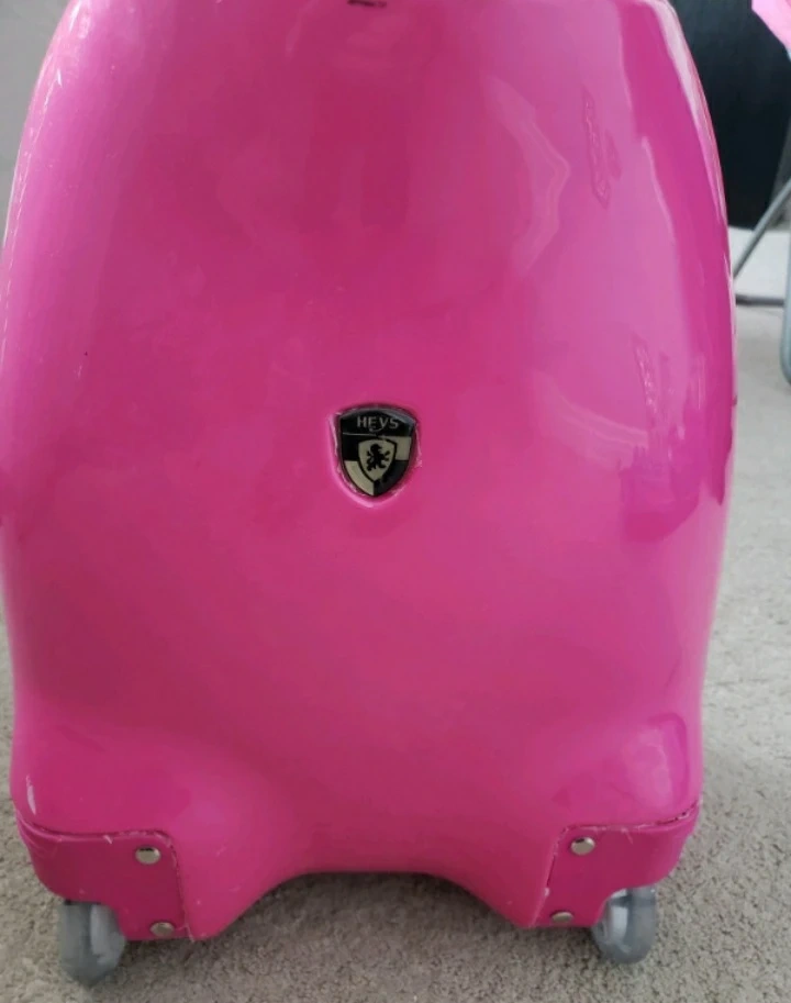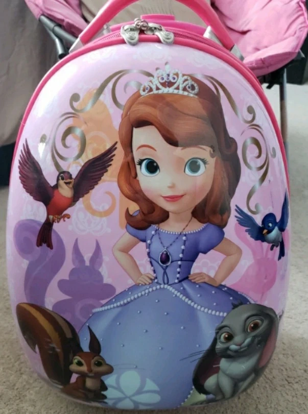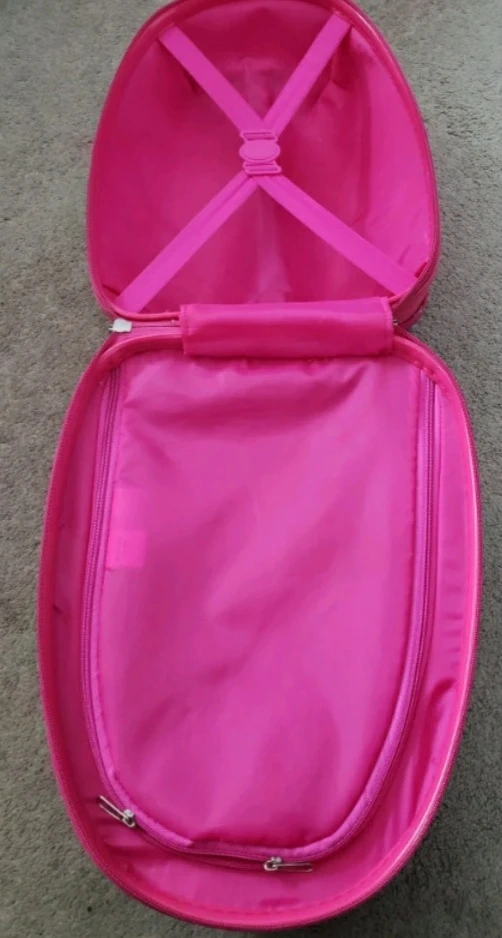 Small size, ideal for children. Has two wheels and a handle. Interior features straps to secure belongings. Excellent for travel.