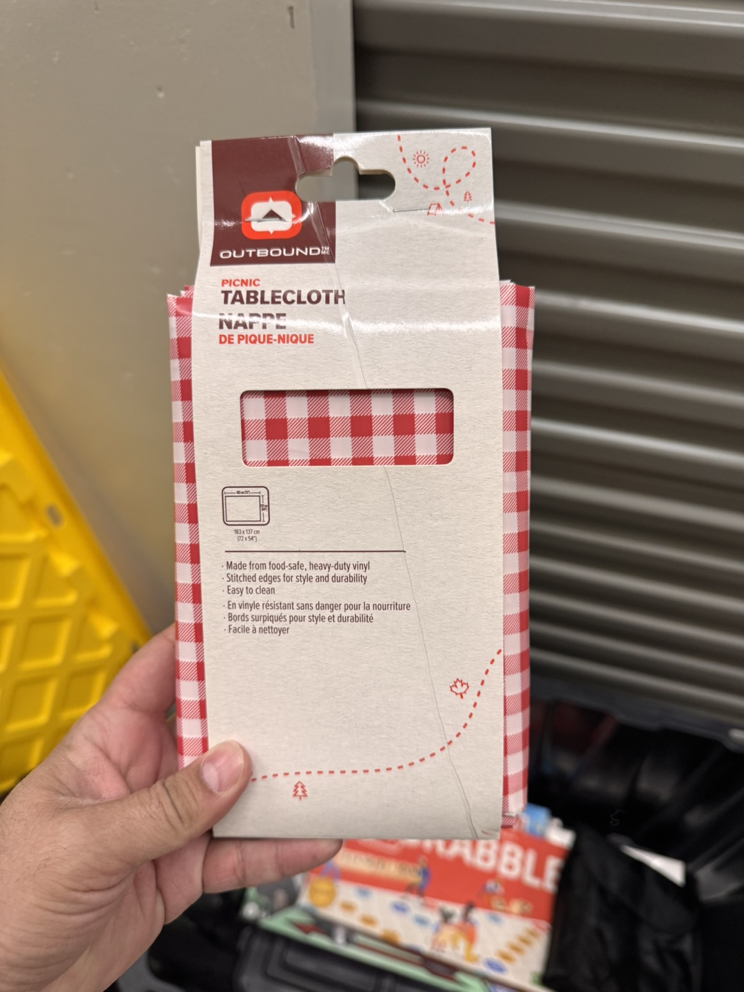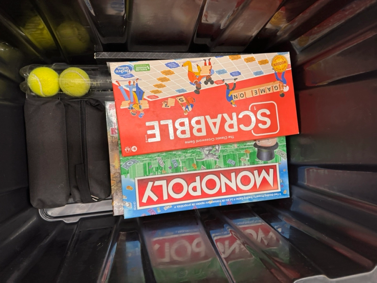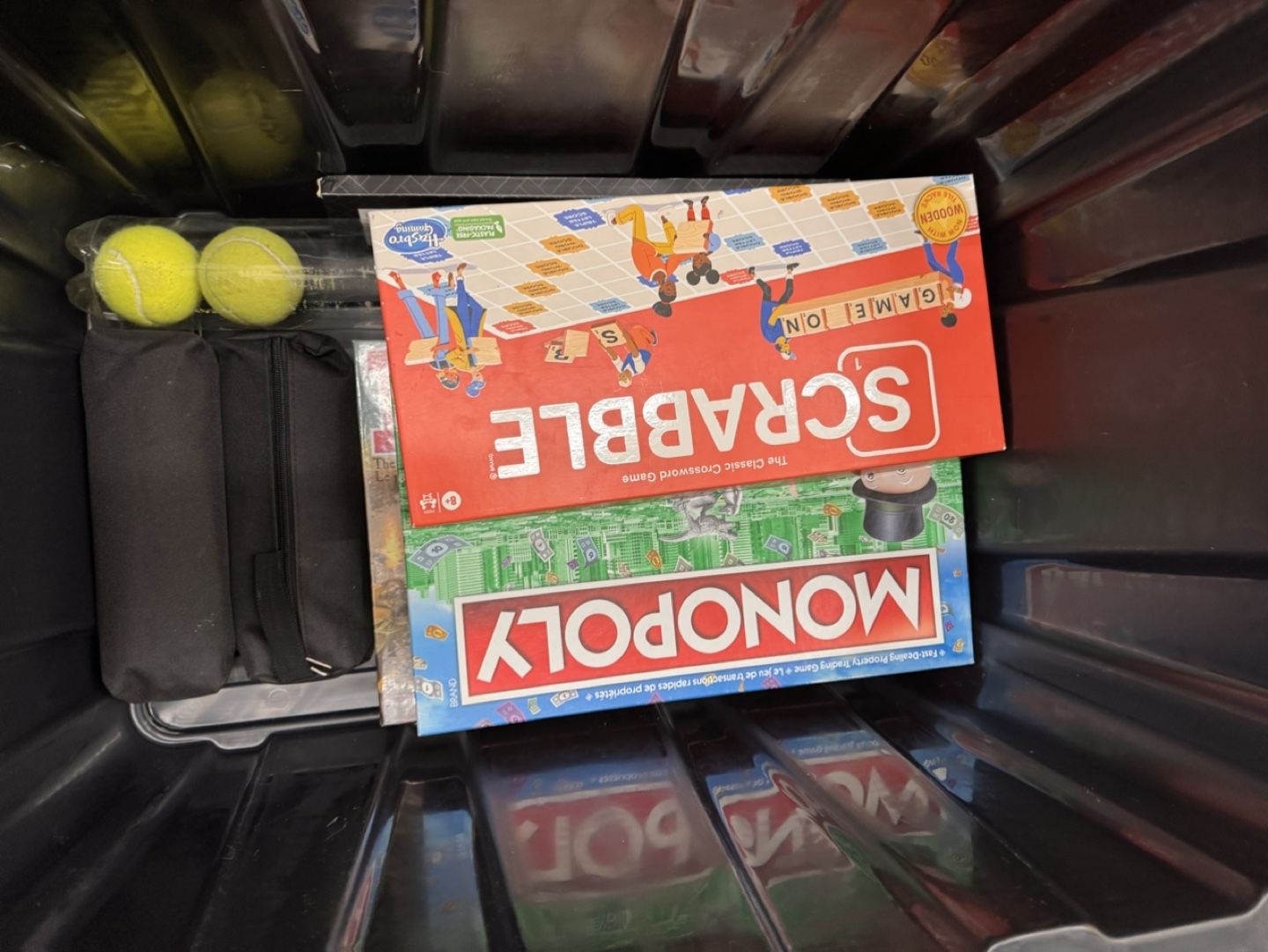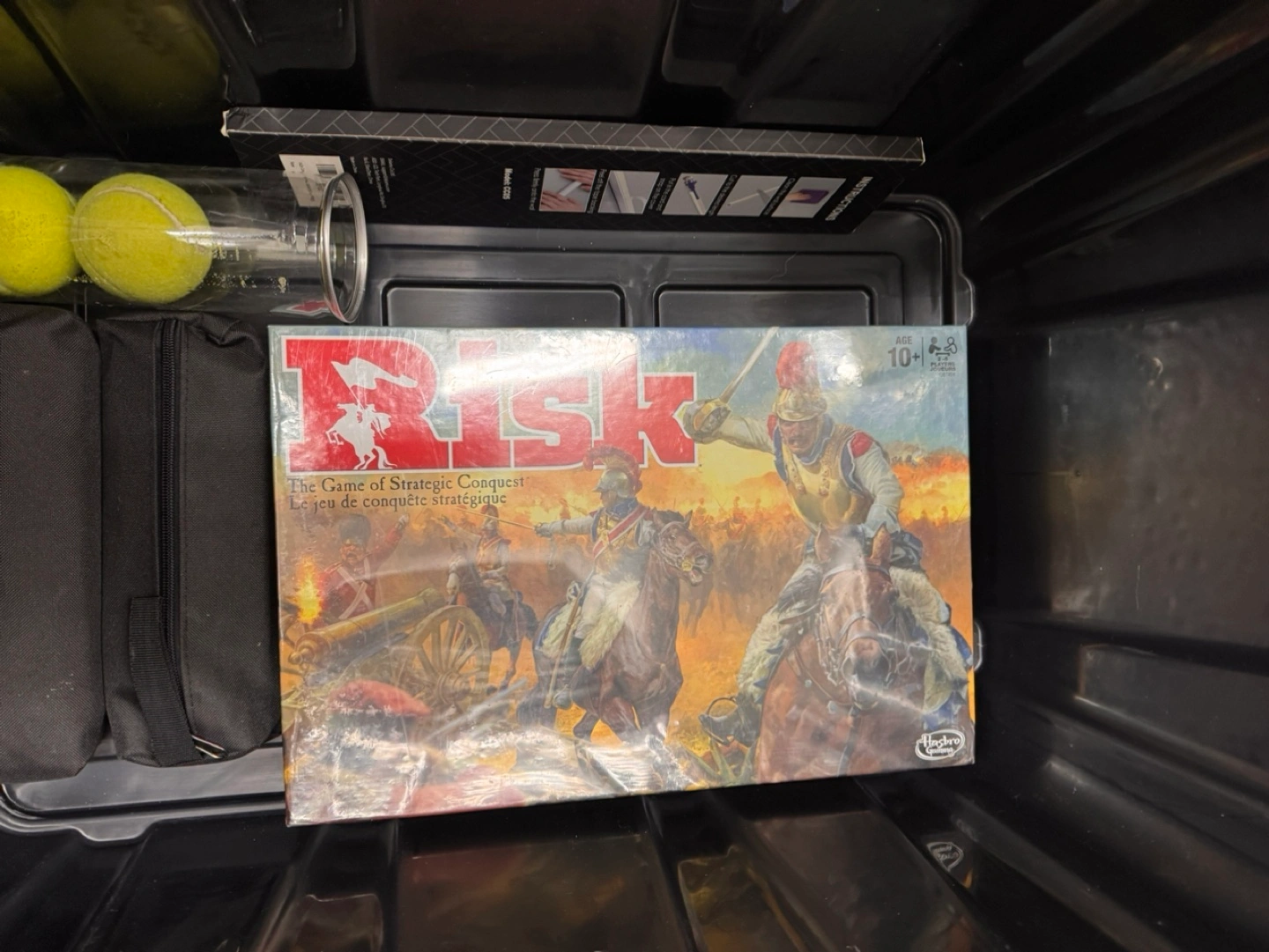 Includes Monopoly, Scrabble, Risk board games. Two UST tennis balls in plastic containers. Outbound picnic tablecloth. Two black zippered carrying cases.