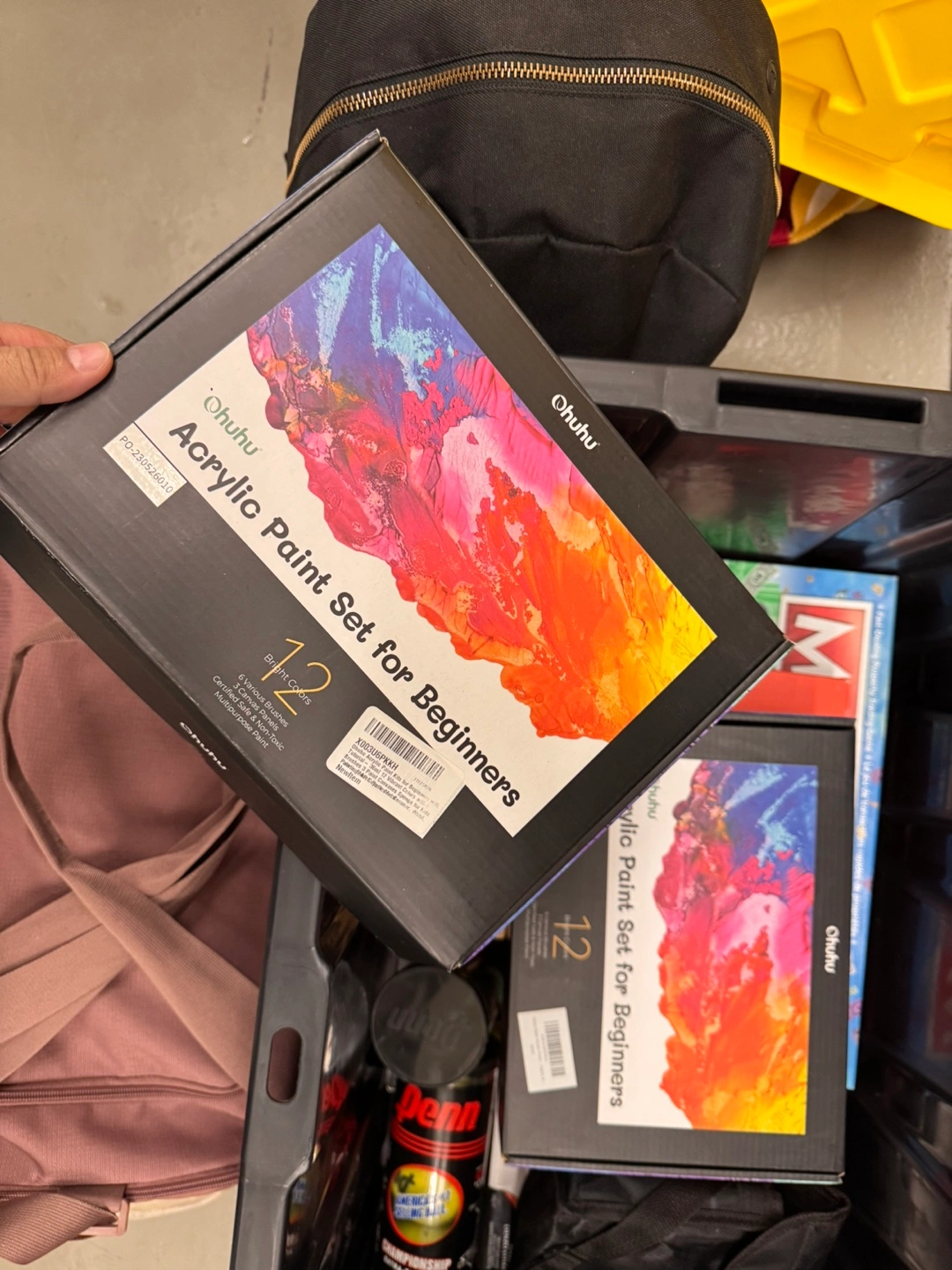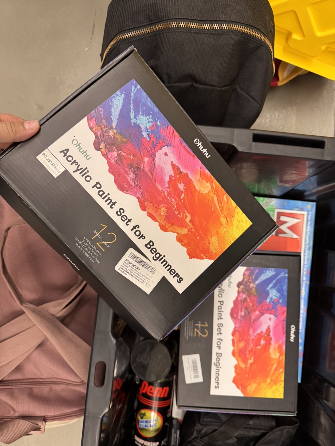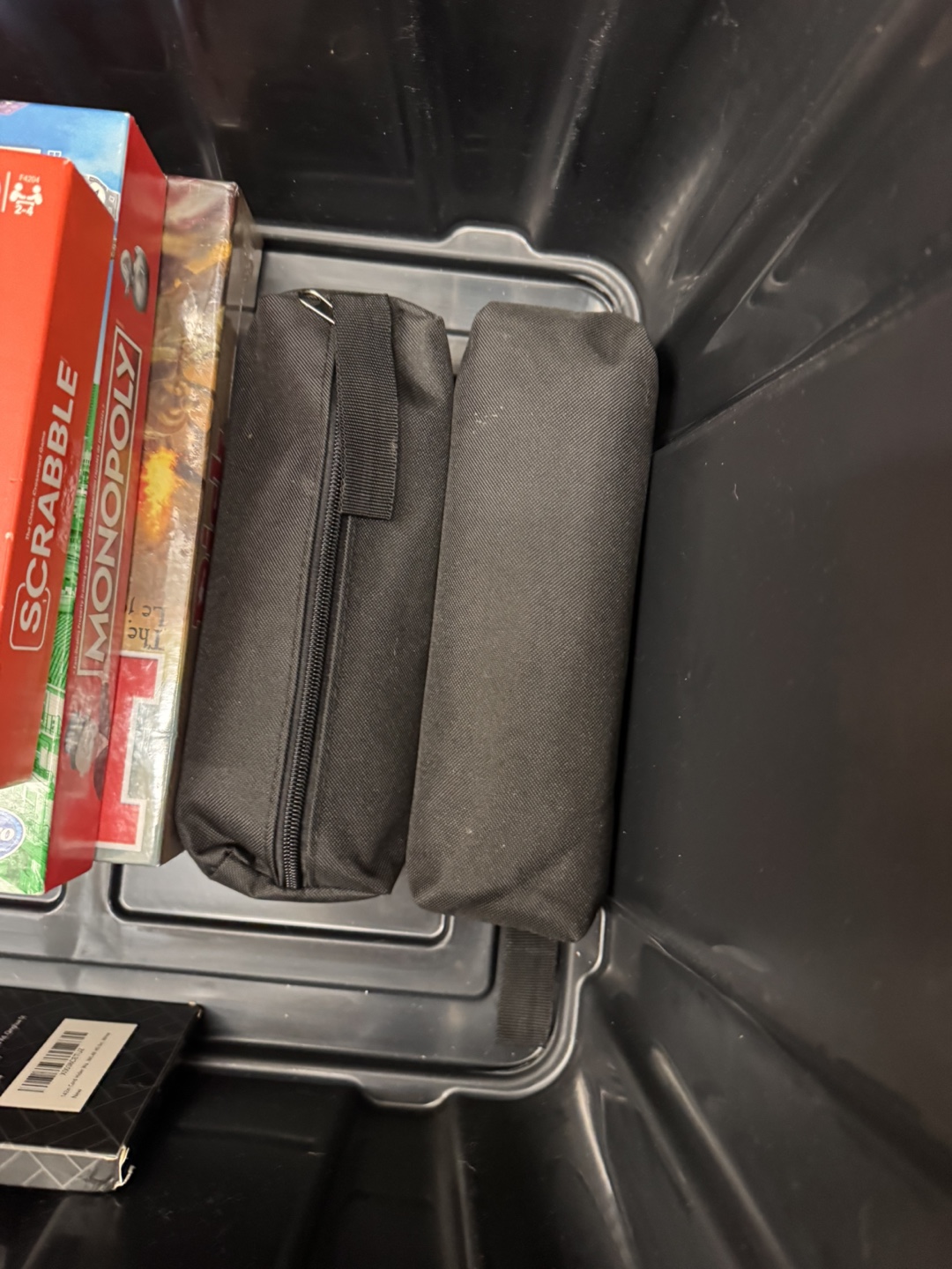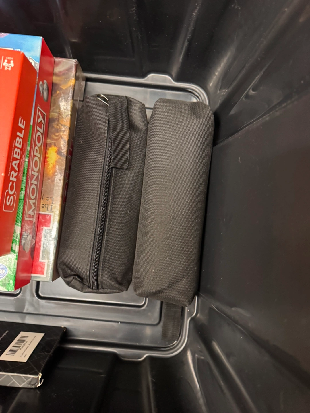 Includes Monopoly, Scrabble, Risk board games. Two UST tennis balls in plastic containers. Outbound picnic tablecloth. Two black zippered carrying cases.