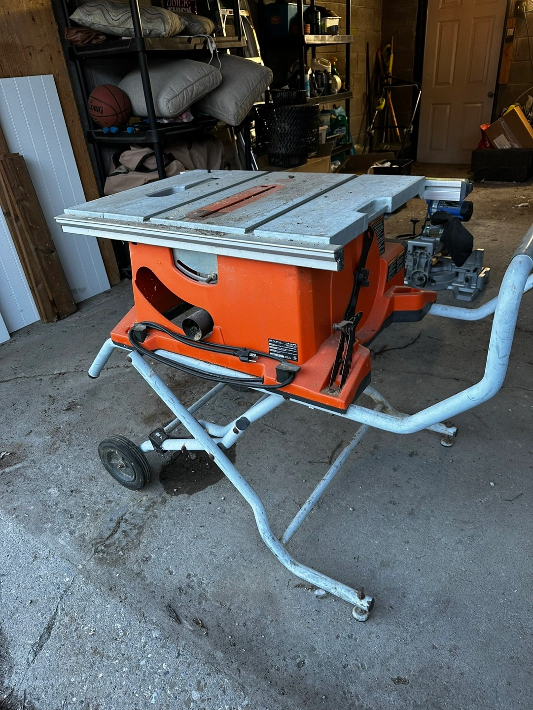 10 inch Rigid Jobsite table saw on stand. Stand folds for easy moving and transport. Works great. Includes rio guard - no blade guard and no dust collector.