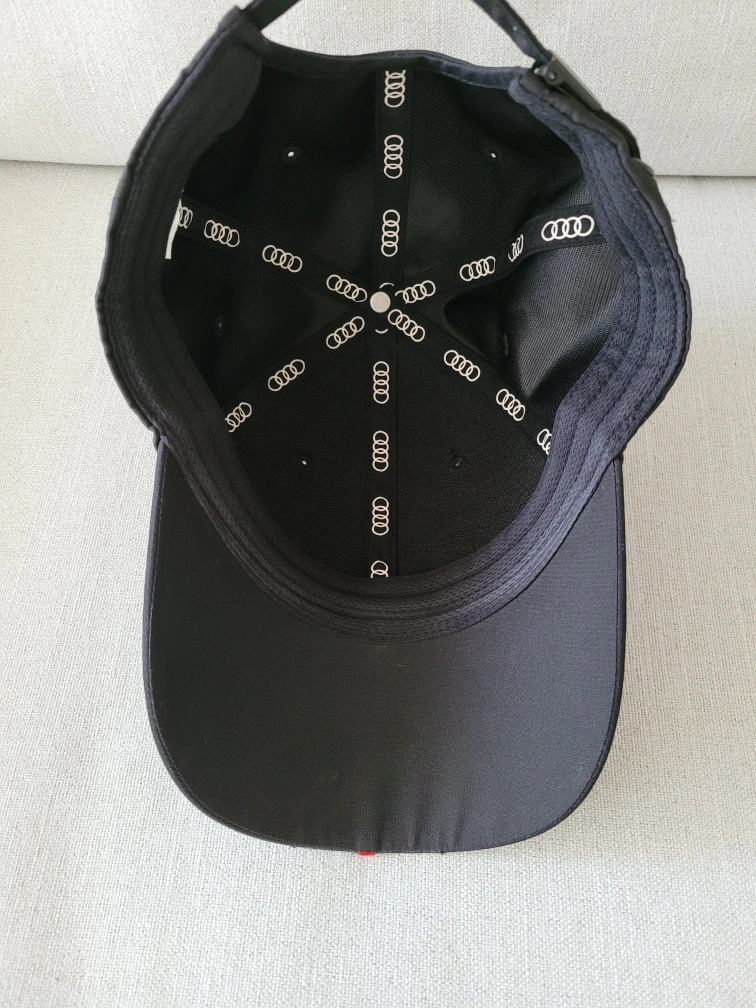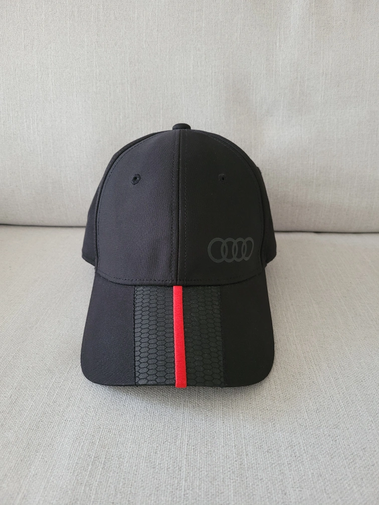 281Black baseball cap. Features the Audi logo and a red stripe. Adjustable back strap. Good condition.