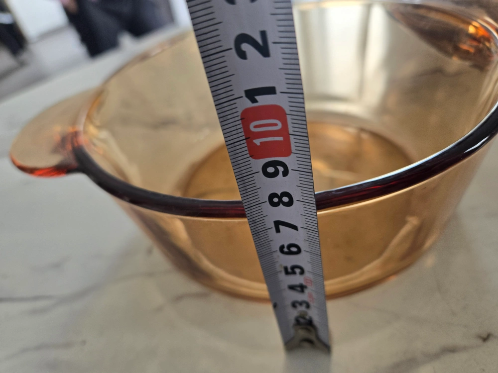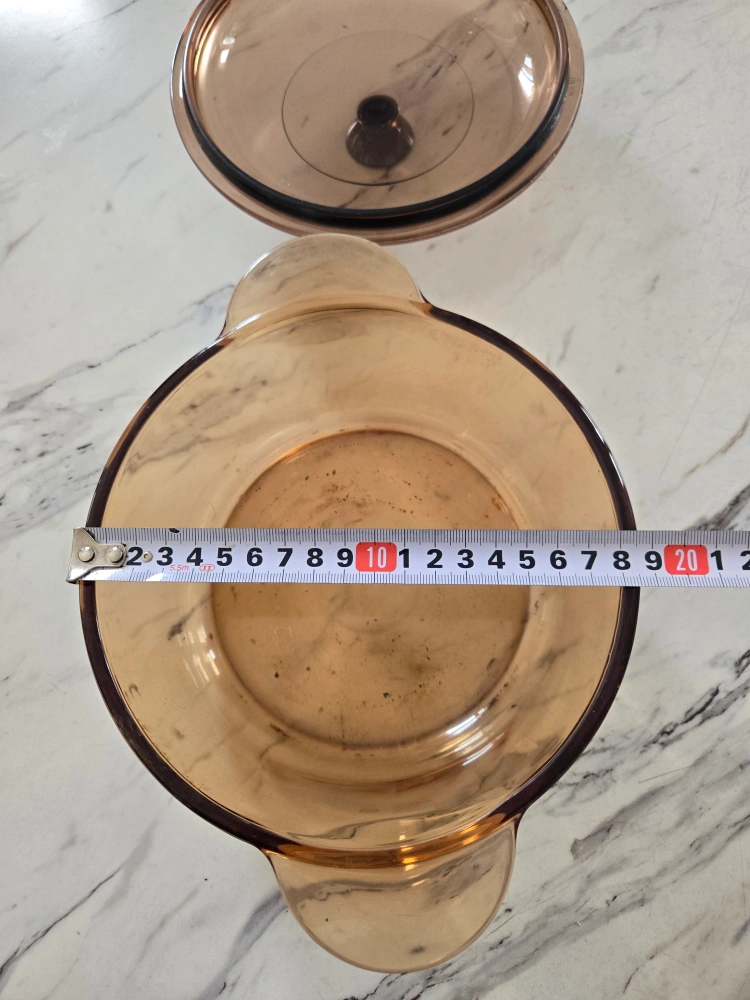 Amber-coloured glass casserole dish. Includes lid. Approximately 10 inches in diameter. Shows some signs of use.