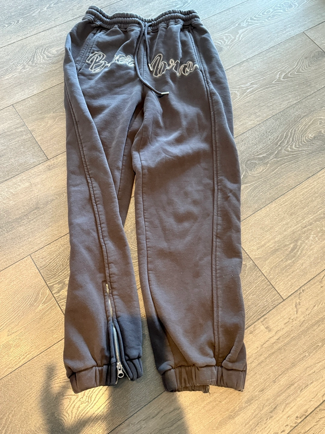 Women's dark grey joggers. Elastic waistband. Side zips. Two back pockets. Embroidered branding. Very warm