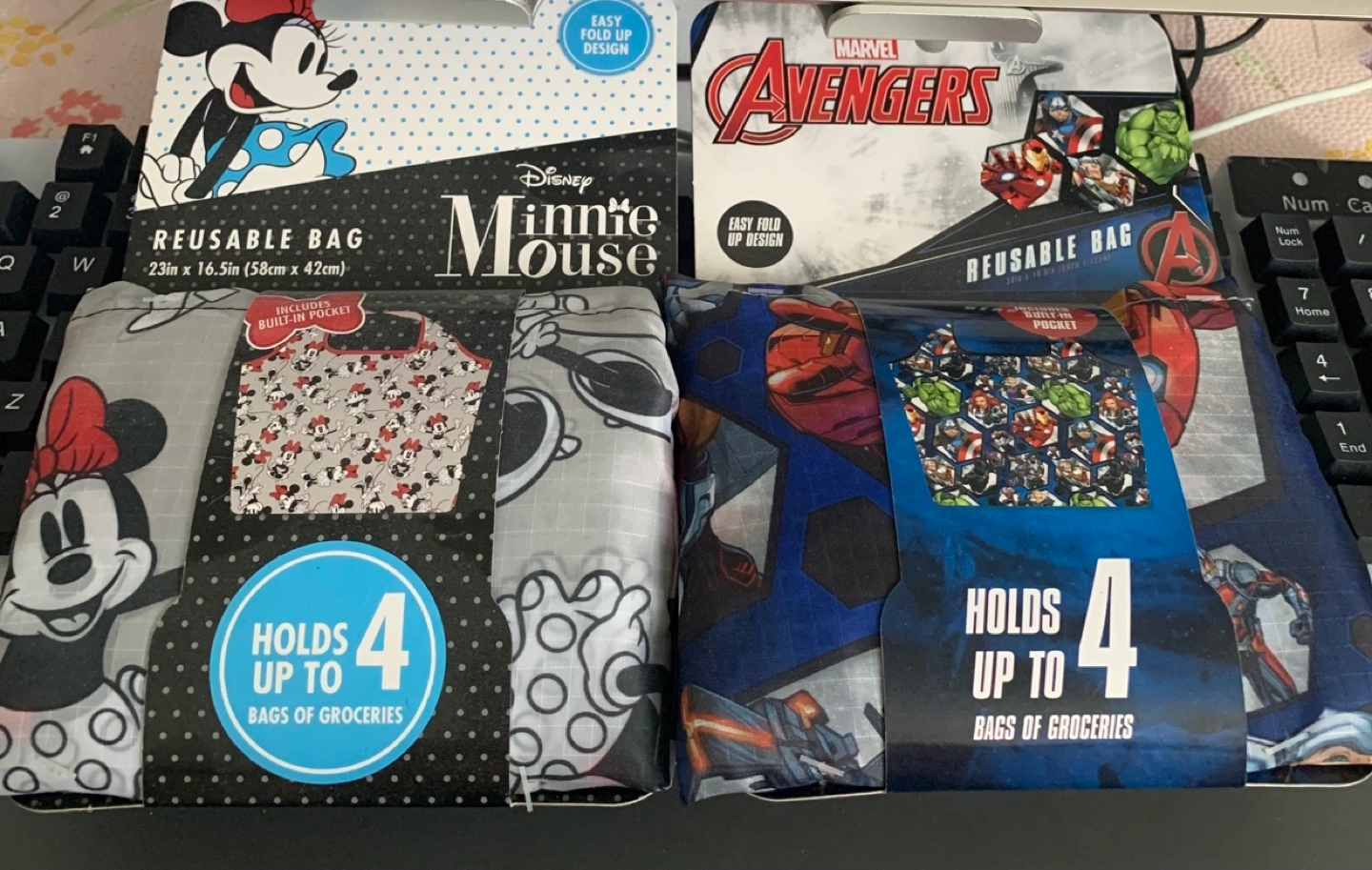Two reusable shopping bags. Minnie Mouse design and Avengers design. Each holds up to four bags of groceries. Easy fold-up design. Includes a built-in pocket New, not used