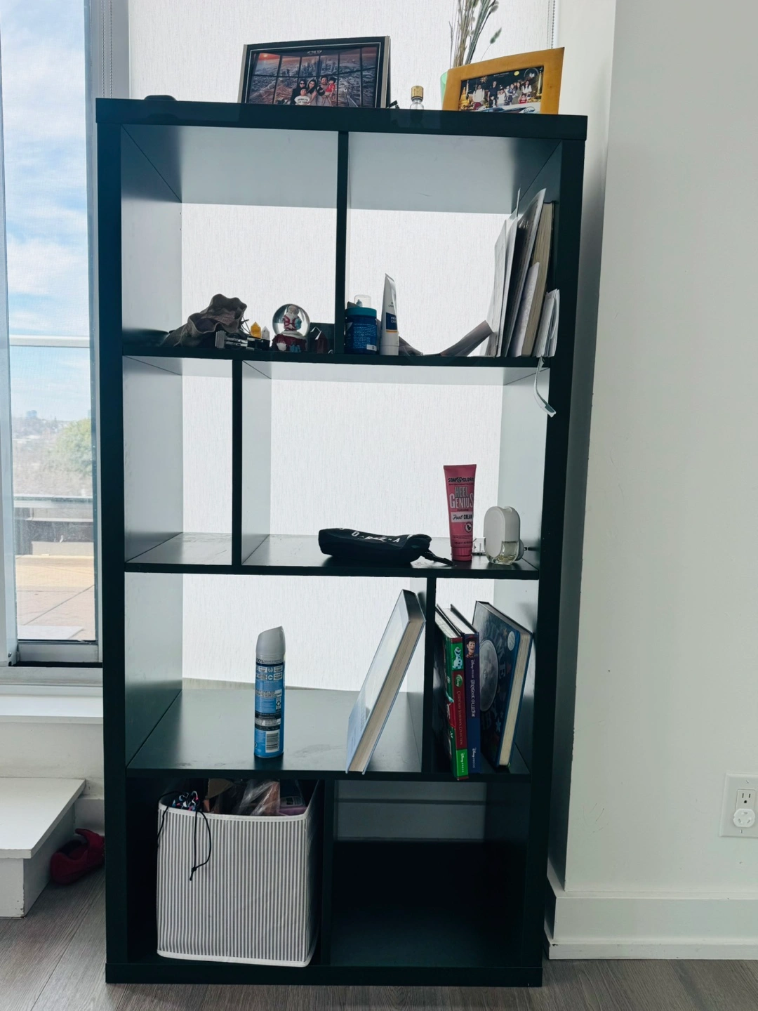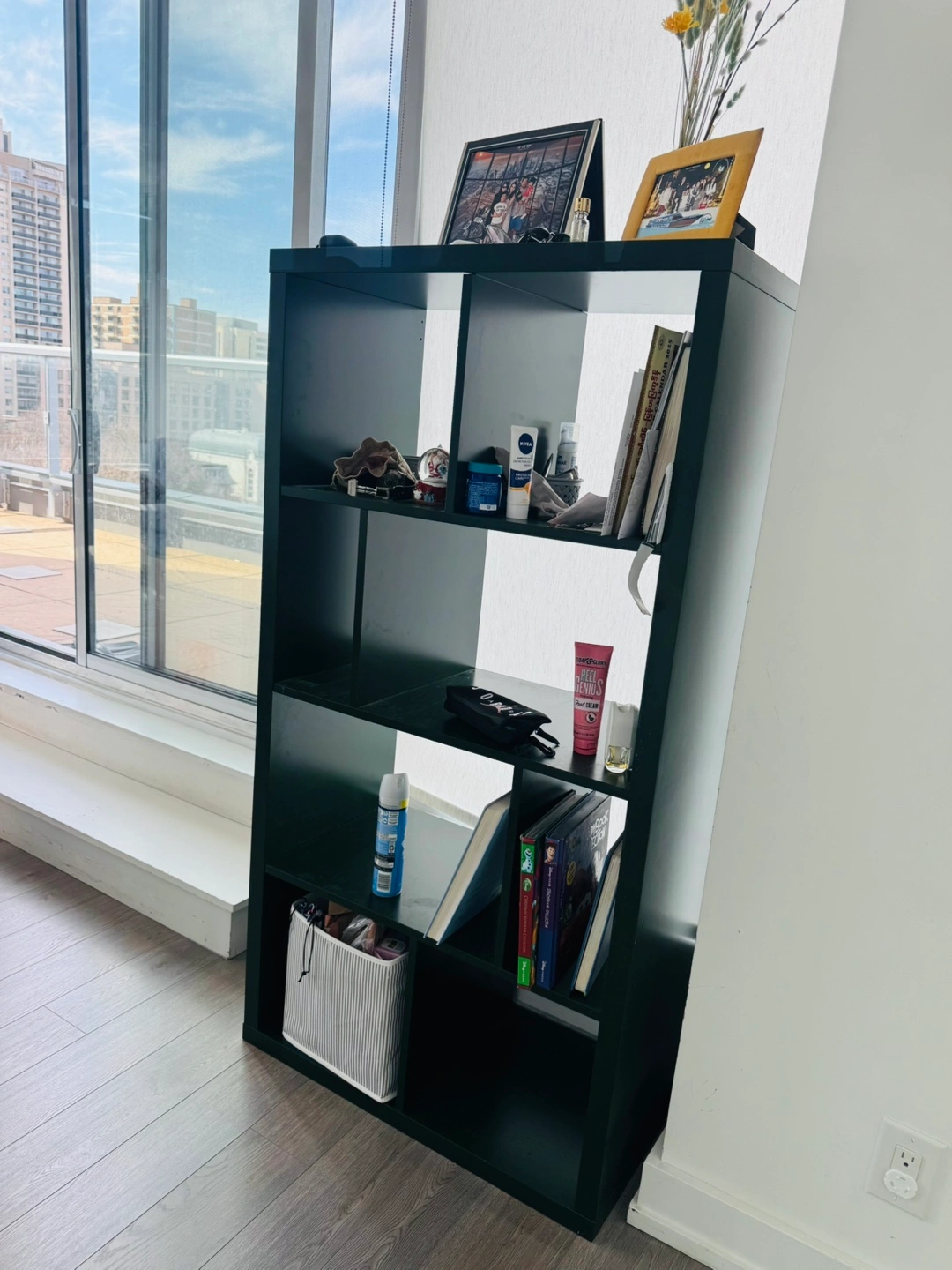 Versatile shelving unit. Nine storage cubes. Great for books, decor, and more. Dark green colour.