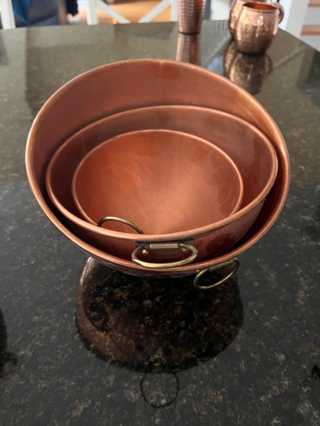 Three nesting copper bowls. Small, medium, and large sizes. Metal handles. Excellent for mixing, serving, or display.