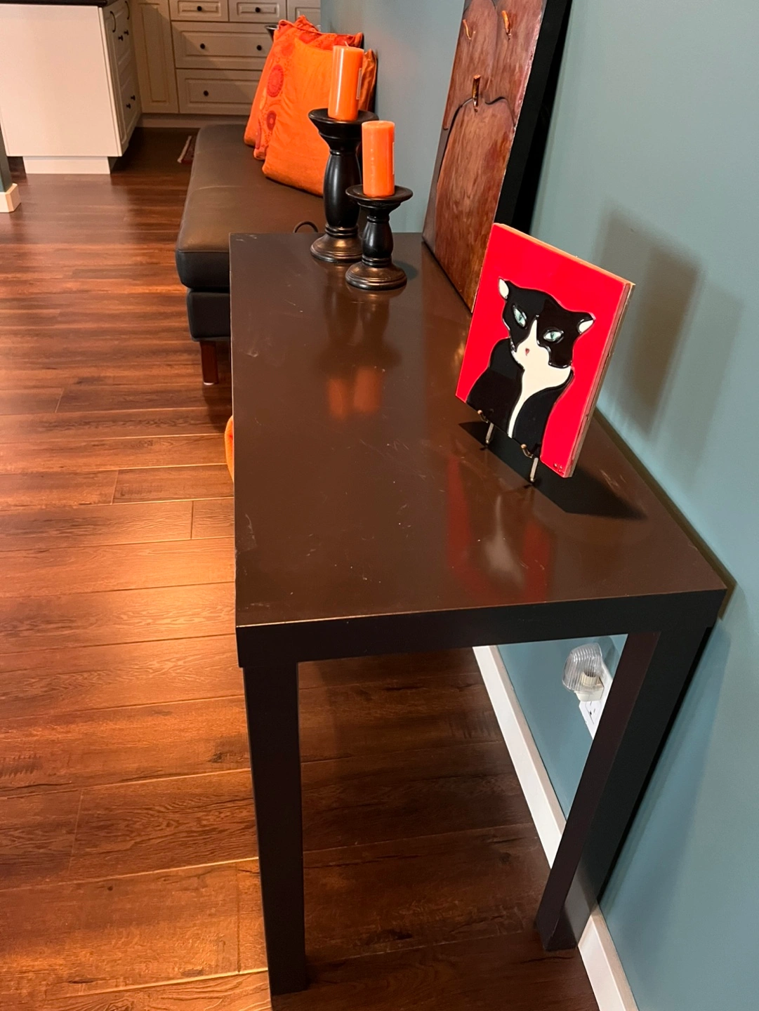 Sleek dark black console table. Simple design, rectangular top. Sturdy legs. Perfect for entryway or living room. Minor surface wear.