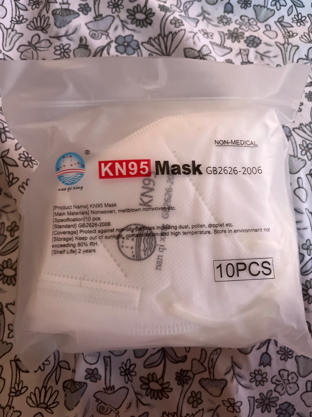 10 pack of KN95 masks. Non-medical. Protect against non-oily particles. 2 year shelf life. Store in a cool, dry place.