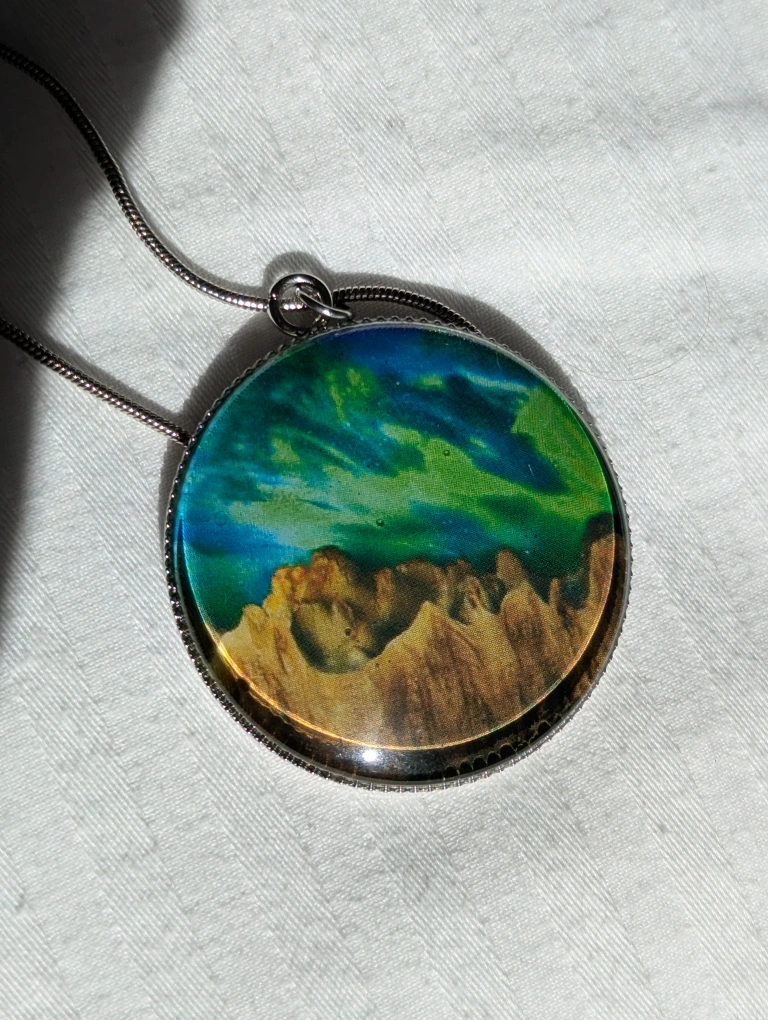 Beautiful pendant necklace. Features a landscape scene encased in clear resin. Silver toned chain included. Round pendant with textured bezel.