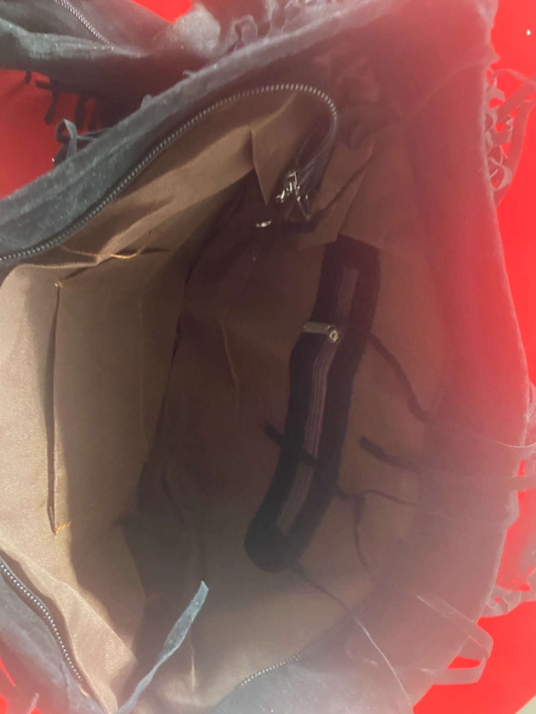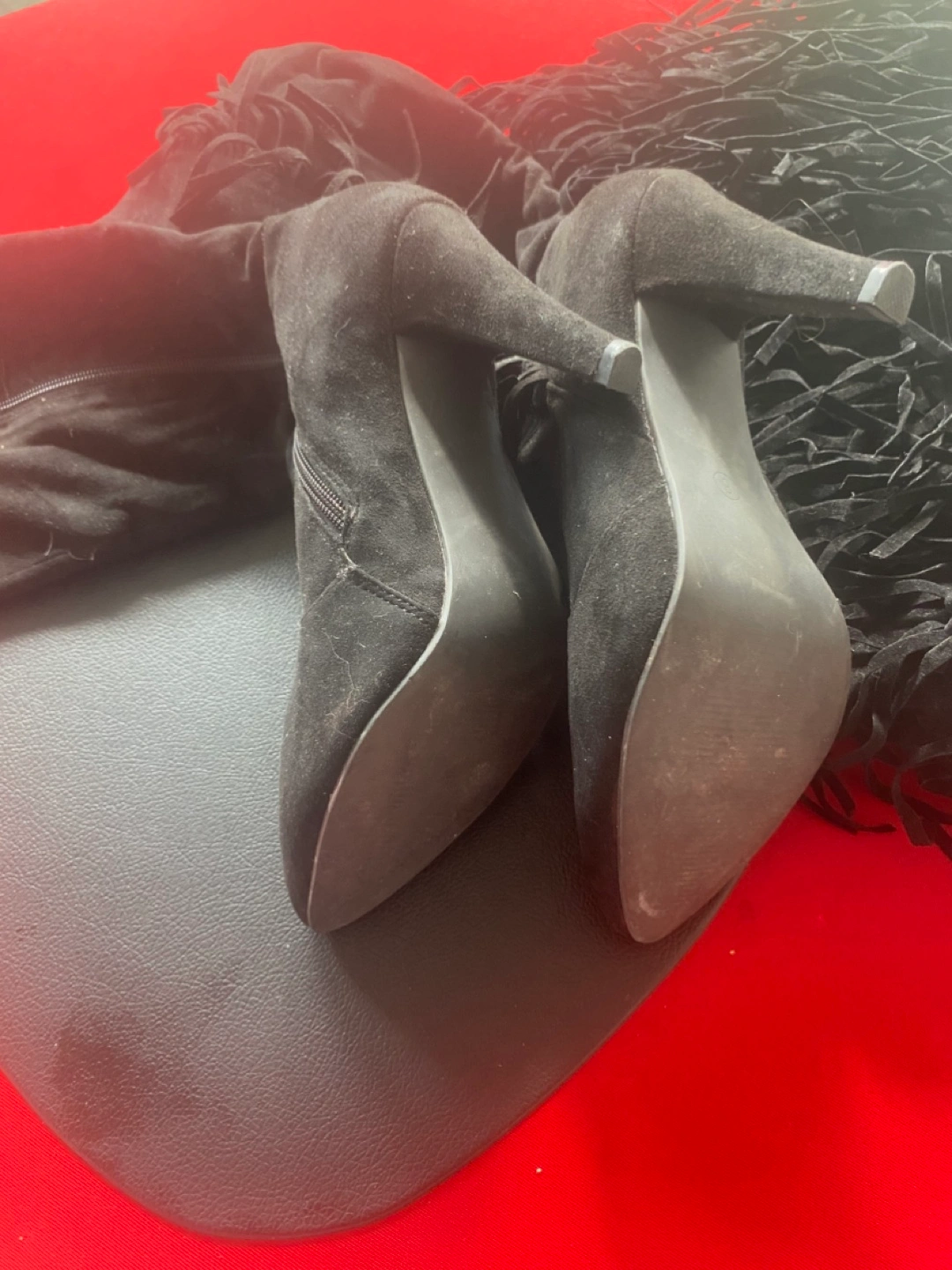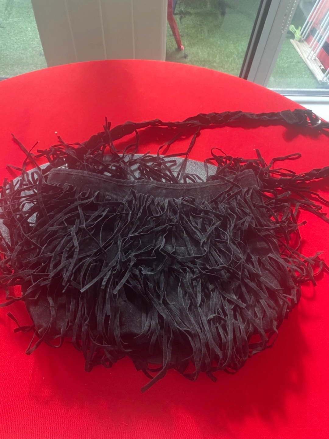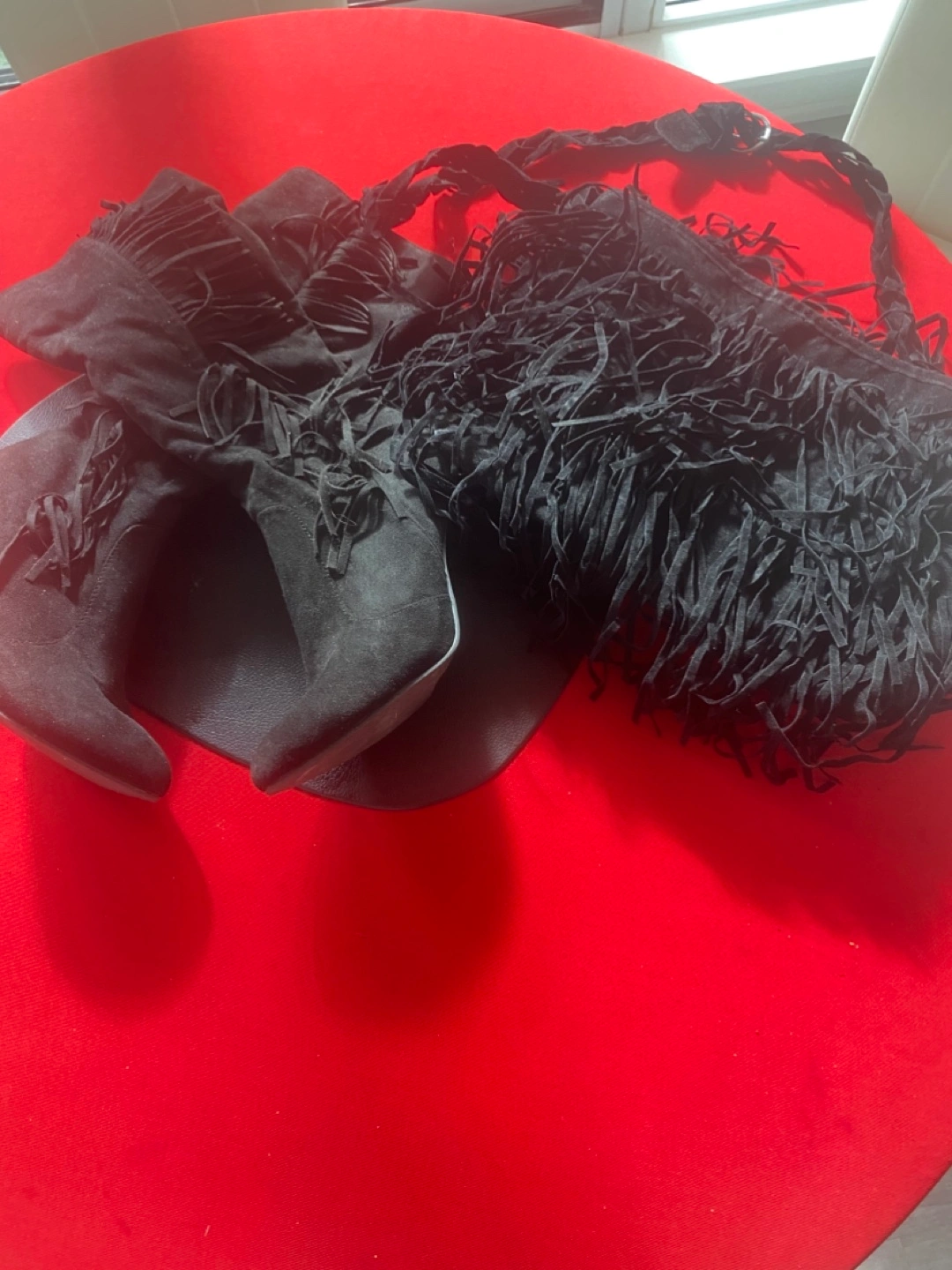 Stylish set, includes knee-high suede boots with fringe detail and a matching fringed shoulder bag. Both items are black. Perfect for a boho look.