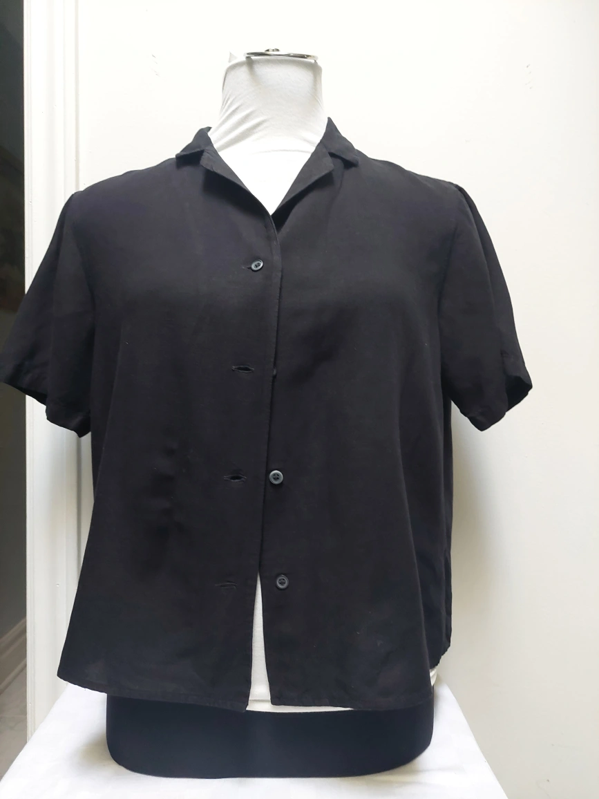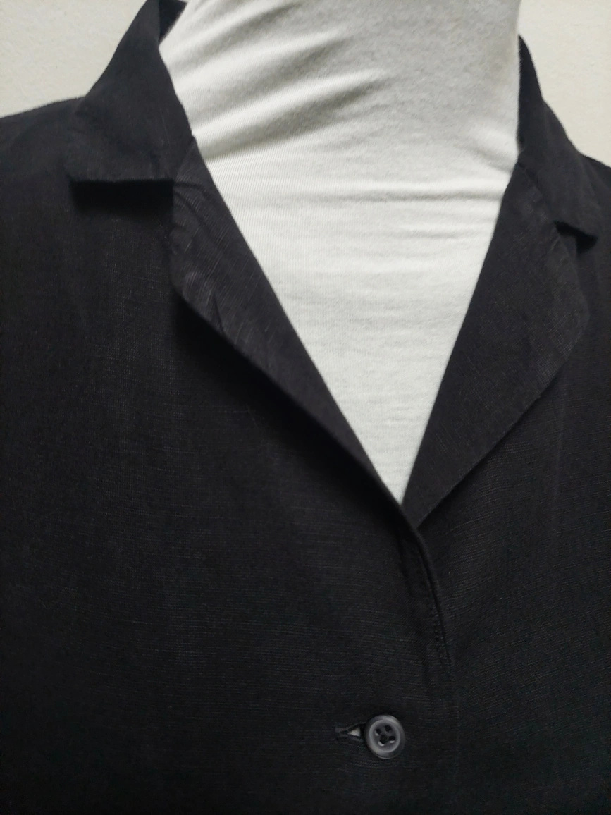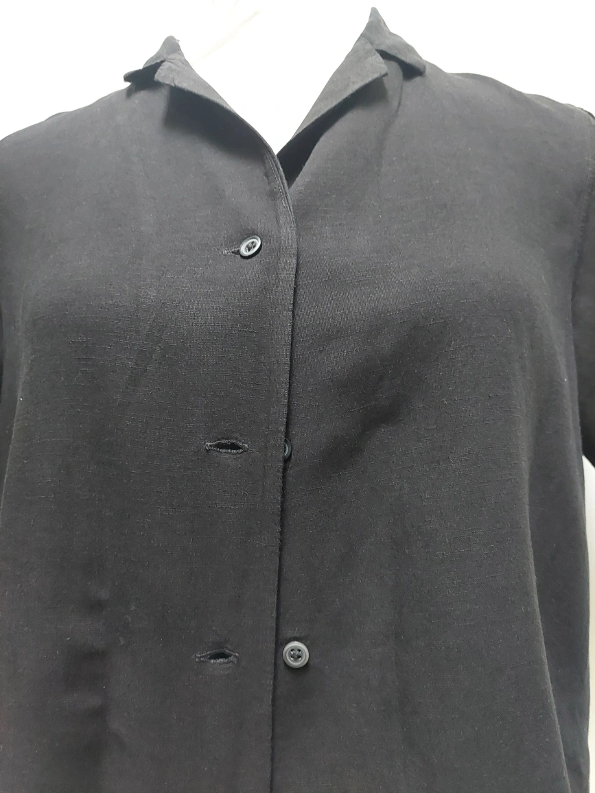 Women's black oversized short sleeve button-down shirt. Size Medium. Made in China. Relaxed fit. Collared neckline. Button closure. Rayon and Linen blend.