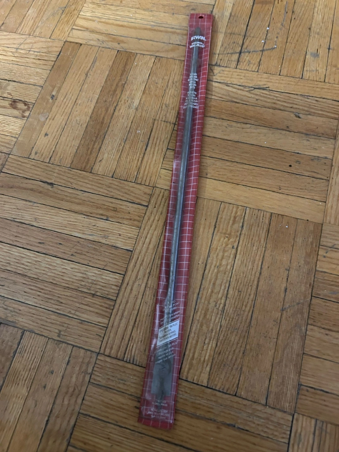 New, unused Irwin Speedbor wood drill bit. Long, slender bit, packaged in original sleeve. Ideal for precise drilling in wood.
