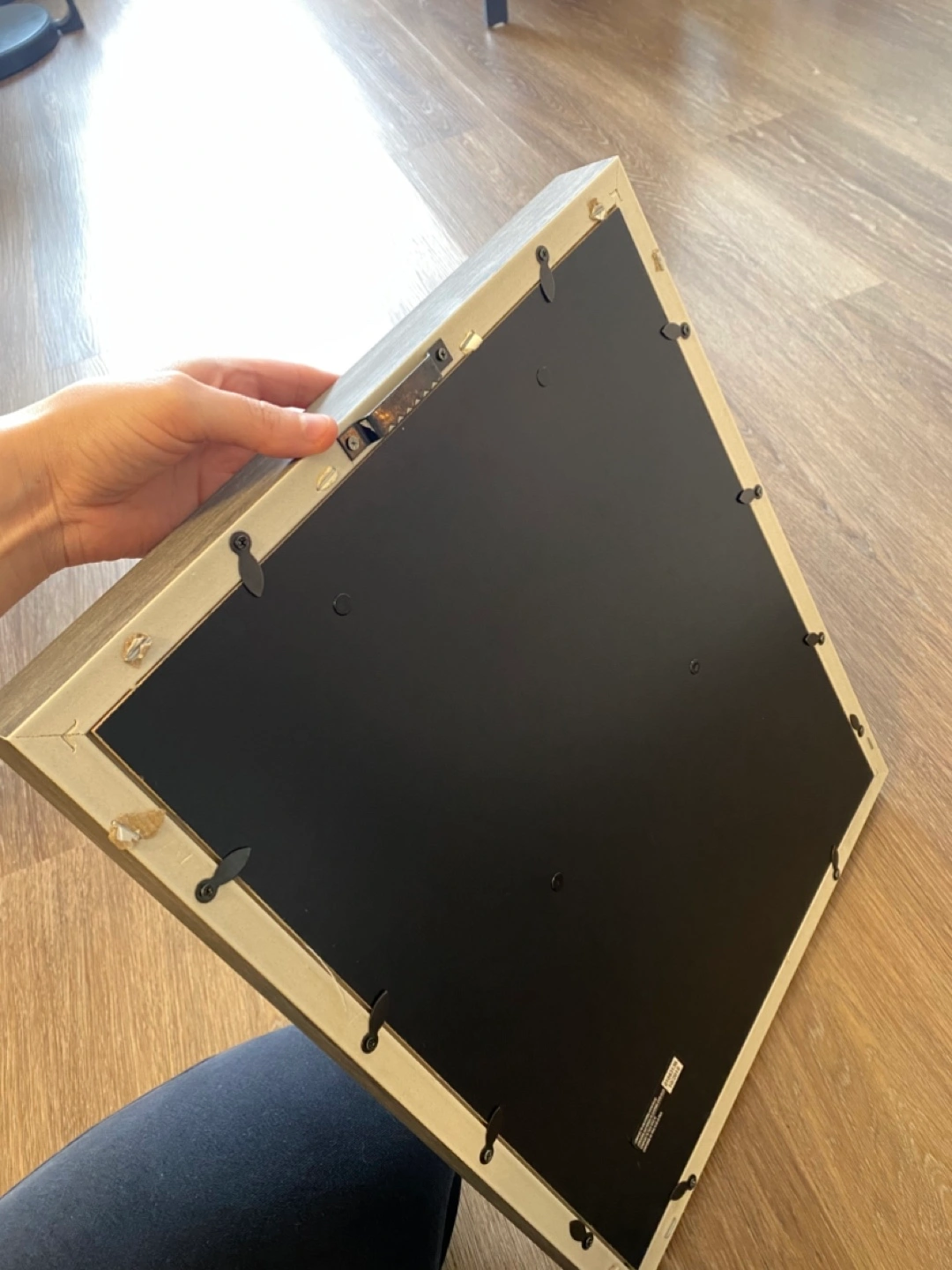 Square grey photo frame with glass cover. Four black clips for inserting photos. Natural coloured backing. Ready to display your favourite memories or art.