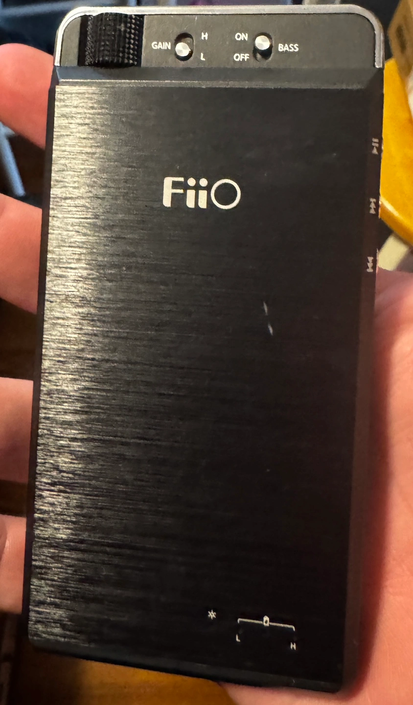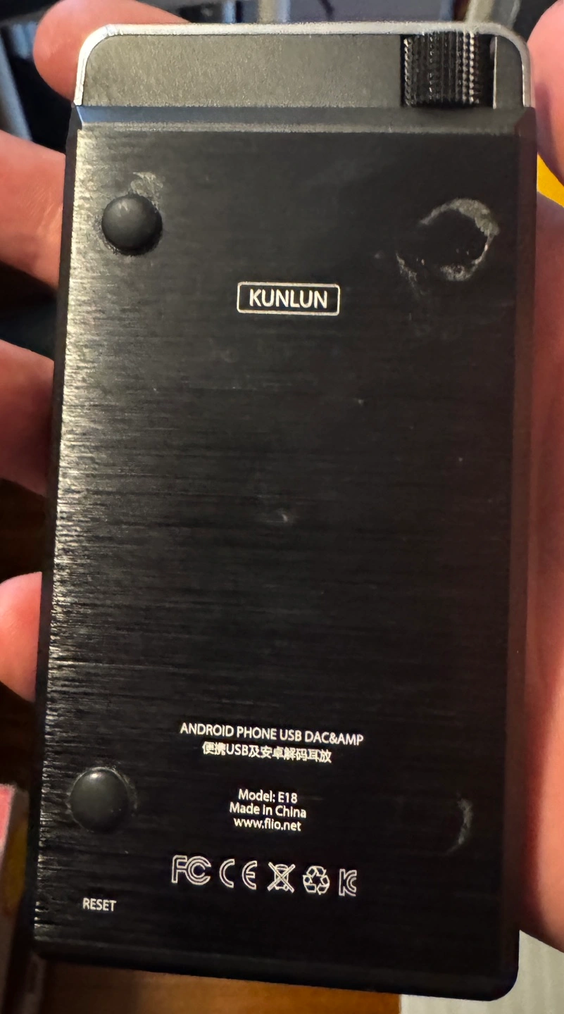 Portable USB DAC amp. Can be used with Android, PC or other inputs. Black with brushed metal finish. Model E18. Includes gain and bass controls.