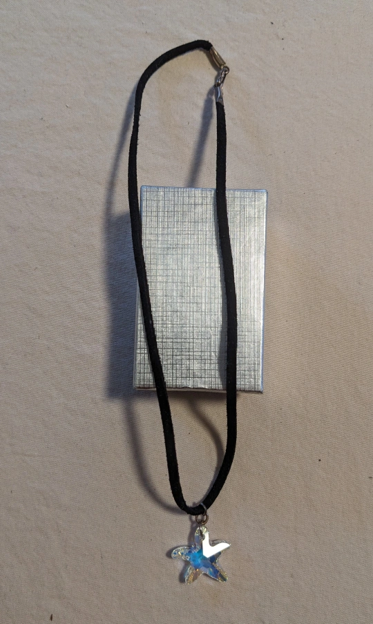 Beautiful choker. Features a sparkly starfish pendant on a black cord. Comes in a silver gift box.