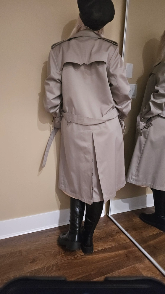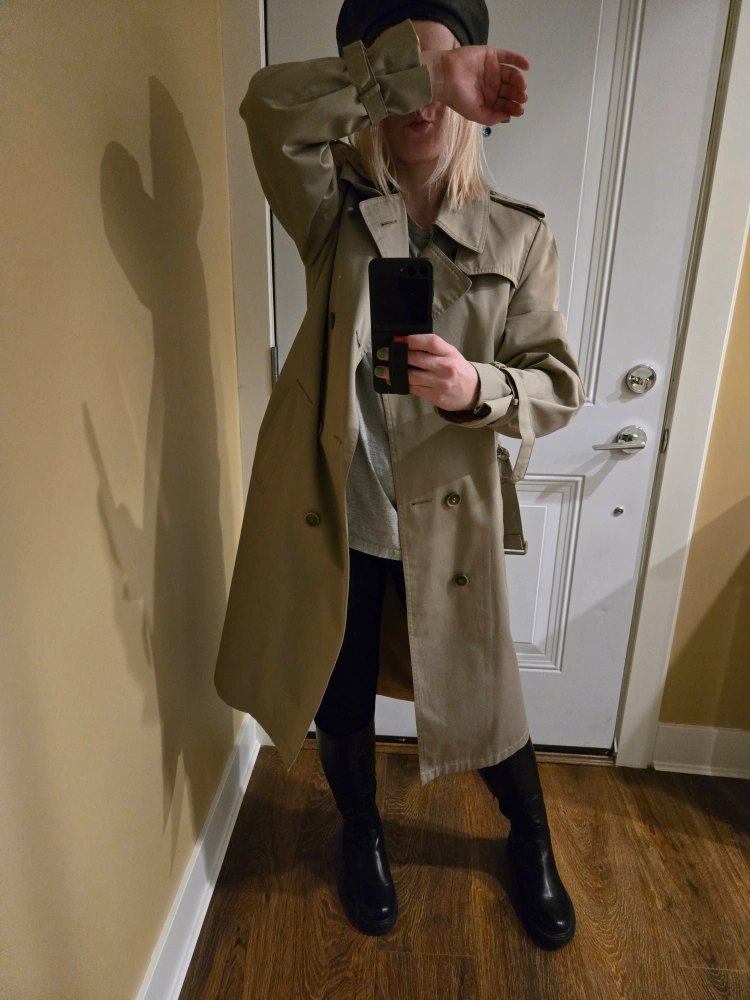 Vintage beige double-breasted trench coat. Features a belt, button cuffs, and a classic design. Size 40R.