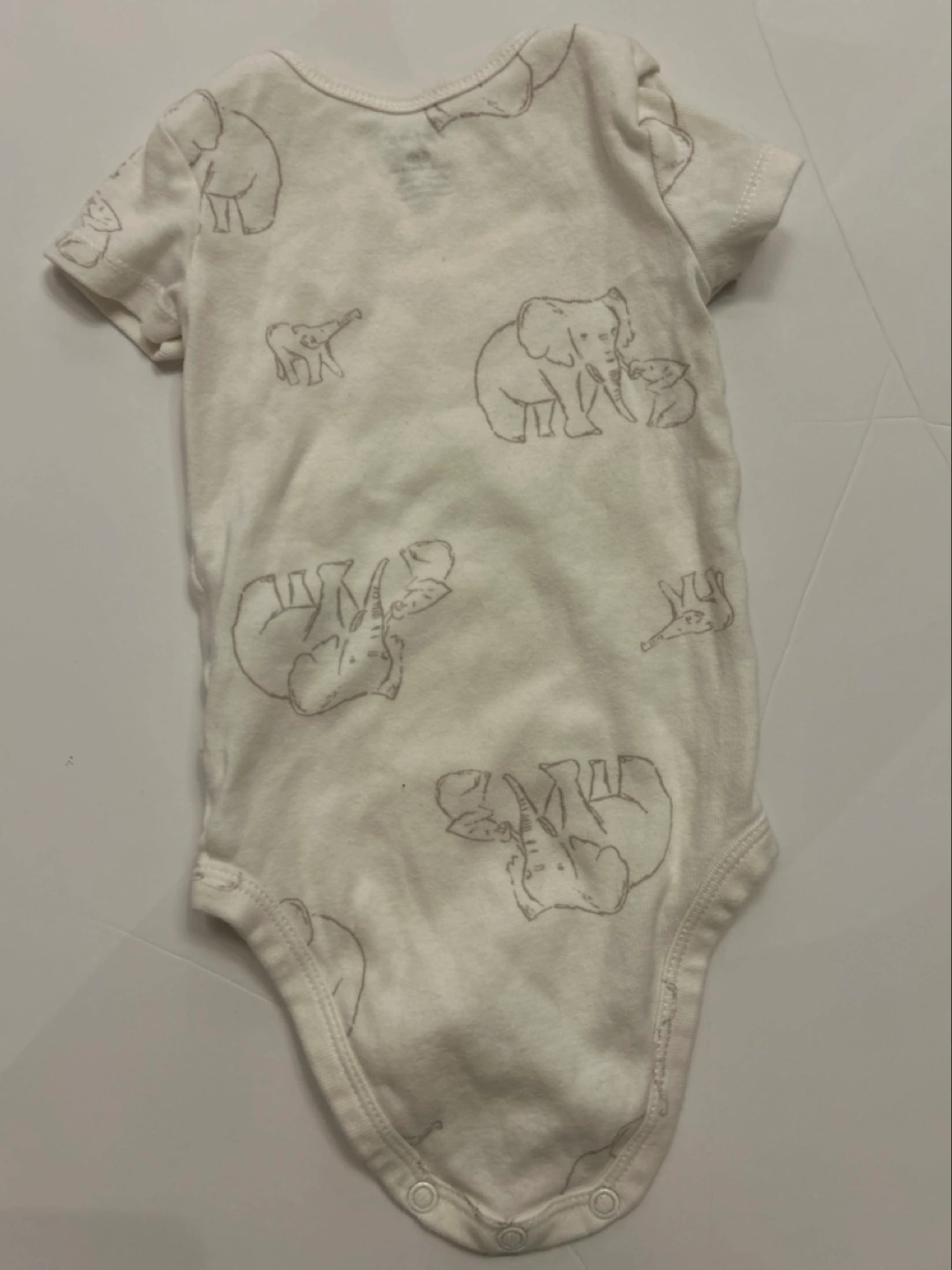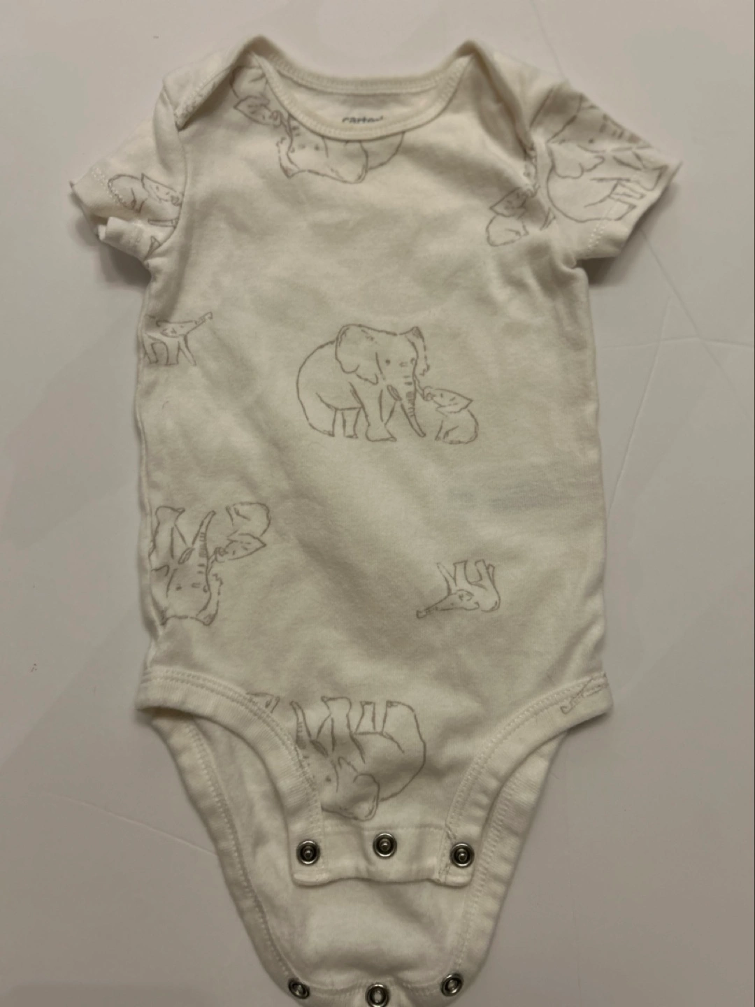 Adorable Carter's baby clothes bundle. Includes one short-sleeve bodysuit featuring elephant print and one long-sleeve sleeper with safari animal print. Neutral colours, soft fabric. Perfect for your little one.